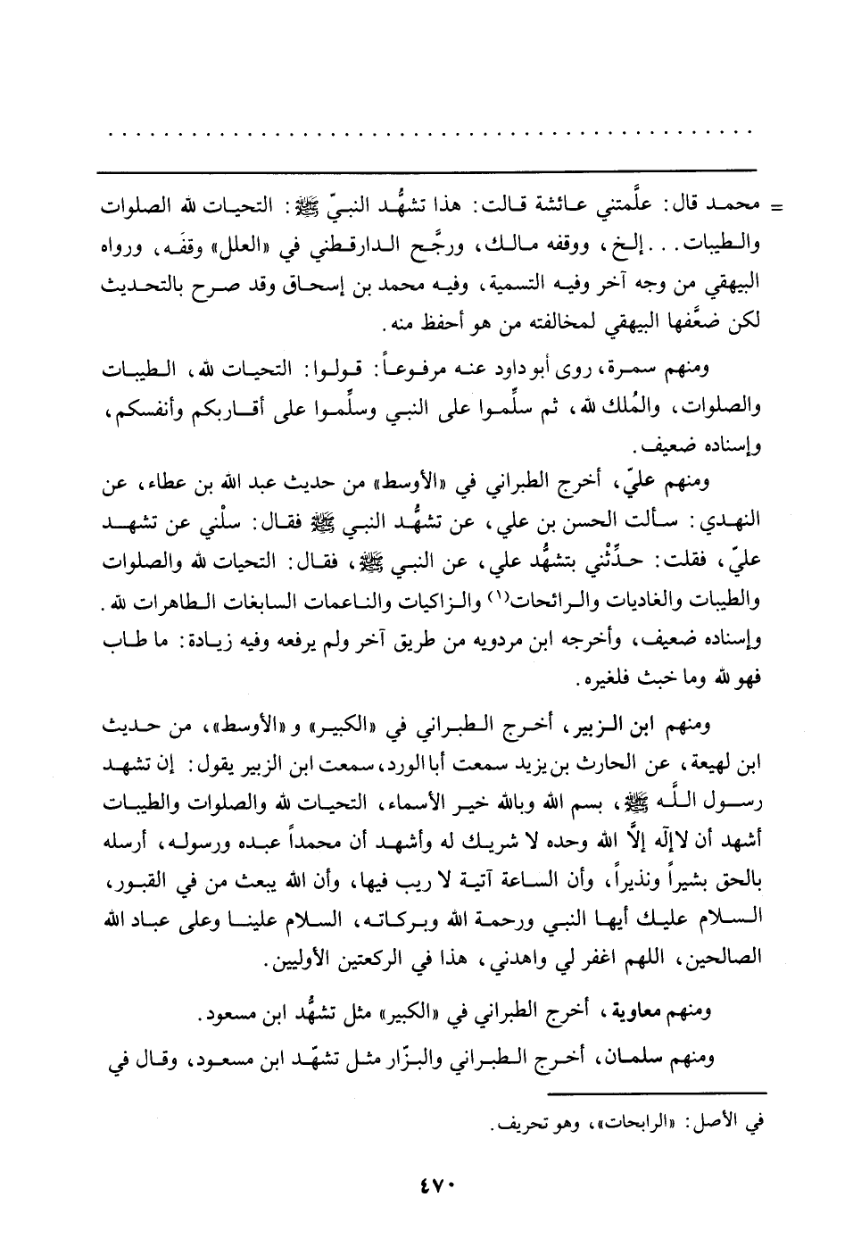 ومنهم علي، أخرج الطبراني في "الأوسط" من حديث عبد الله بن عطاء عن النهدي: سألت الحسن بن علي، عن تشهُّد النبي صلى الله عليه وسلم فقال: سلني عن تشهد علي، فقلت: حدِّثني بتشهد علي، عن النبي صلى الله عليه وسلم، فقال: التحيات لله والصلوات والطيبات والغاديات والرائحات (في الأصل: "الرابحات"، وهو تحريف) والزاكيات والناعمات السابغات الطاهرات لله، وإسناده ضعيف، وأخرجه ابن مردويه من طريق آخر ولم يرفعه وفيه زيادة: ما طاب فهو لله وما خبث فلغيره.