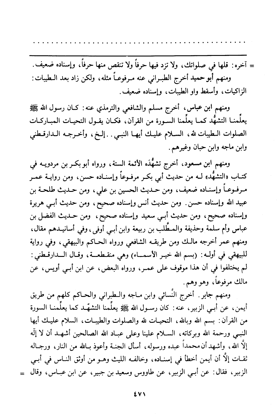 ومنهم ابن مسعود، أخرج تشهُّدَه الأئمة الستة، ورواه أبو بكر بن مردويه في كتاب "التشهد" له من حديث أبي بكر مرفوعاً وإسناده حسن، ومن رواية عمر مرفوعاً وإسناده ضعيف، ومن حديث الحسين بن علي، ومن حديث طلحة بن عبيد الله وإسناده حسن. ومن حديث أنس وإسناده صحيح، ومن حديث أبي هريرة وإسناده صحيح، ومن حديث أبي سعيد وإسناده صحيح، ومن حديث الفضل بن عباس وأم سلمة وحذيفة والمطلب بن ربيعة وابن أبي أوفى، وفي أسانيدهم مقال، ومنهم عمر أخرجه مالك ومن طريقه الشافعي ورواه الحاكم والبيهقي، وفي رواية للبيهقي في أوله: (بسم الله خير الأسماء) وهي منقطعة، وقال الدارقطني: لم يختلفوا في أن هذا موقوف على عمر، ورواه البعض، عن ابن أبي أويس، عن مالك مرفوعاً، وهو وهم.