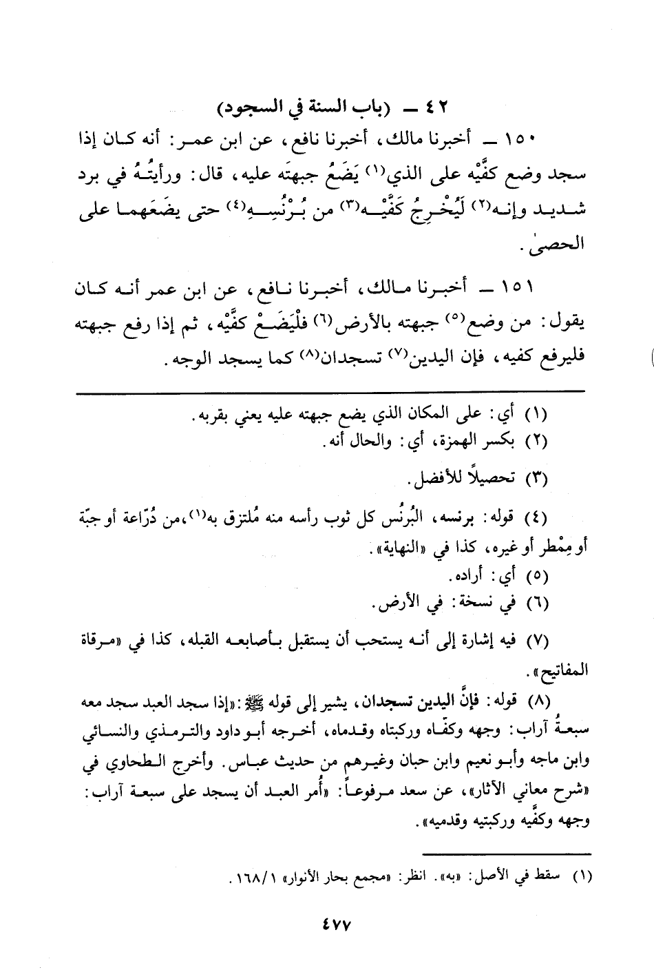 150 - أَخْبَرَنَا مَالِكٌ، أَخْبَرَنَا نَافِعٌ، عَنِ ابْنِ عُمَرَ: أَنَّهُ كَانَ إِذَا سَجَدَ وَضَعَ كفَّيه عَلَى الَّذِي (¬1) يَضَعُ جَبهتَه عَلَيْهِ، قَالَ: ورأيتُهُ فِي بَرْدٍ شَدِيدٍ وَإِنَّهُ (¬2) لَيُخْرِجُ كَفَّيه (¬3) مِنْ بُرْنُسِهِ (¬4) حَتَّى يضَعَهما عَلَى الْحَصَى.