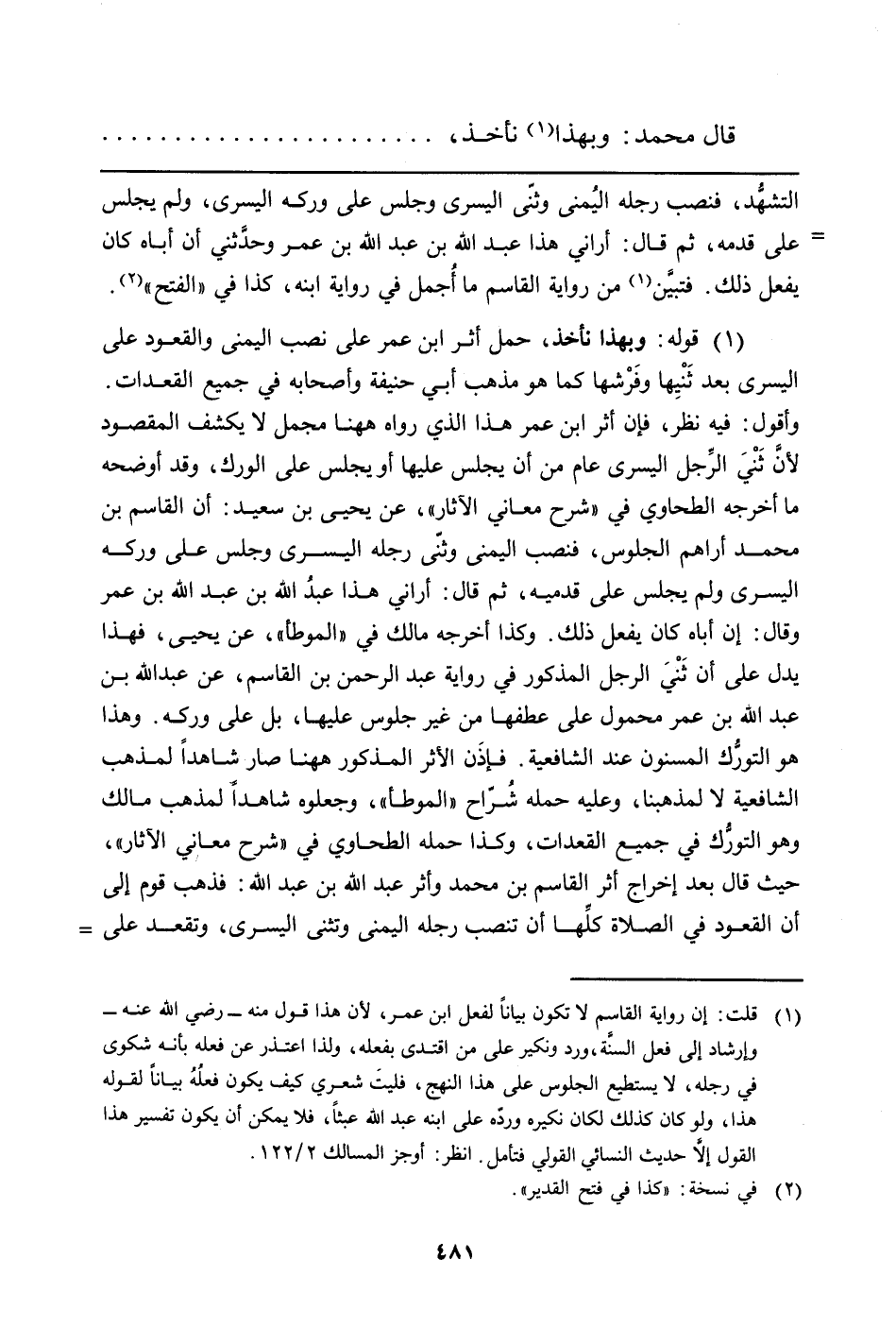 (¬1) قوله: وبهذا نأخذ، حمل أثر ابن عمر على نصب اليمنى والقعود على اليسرى بعد ثَنْيِها وفَرشها كما هو مذهب أبي حنيفة وأصحابه في جميع القعدات. وأقول: فيه نظر، فإن أثر ابن عمر هذا الذي رواه ههنا مجمل لا يكشف المقصود لأنّ ثَنْيَ الرِّجل اليسرى عام من أن يجلس عليها أو يجلس على الورك، وقد أوضحه ما أخرجه الطحاوي في "شرح معاني الآثار"، عن يحيى بن سعيد: أن القاسم بن محمد أراهم الجلوس، فنصب اليمنى وثنى رجله اليسرى وجلس على وركه اليسرى ولم يجلس على قدميه، ثم قال: أراني هذا عبدُ الله بن عبد الله بن عمر وقال: إن أباه كان يفعل ذلك. وكذا أخرجه مالك في "الموطأ"، عن يحيى، فهذا يدل على أن ثَنْيَ الرجل المذكور في رواية عبد الرحمن بن القاسم، عن عبد الله بن عبد الله بن عمر محمول على عطفها من غير جلوس عليها، بل على وركه. وهذا هو التورُّك المسنون عند الشافعية. فإذن الأثر المذكور ههنا صار شاهداً لمذهب الشافعية لا لمذهبنا، وعليه حمله شُرّاح "الموطأ"، وجعلوه شاهداً لمذهب مالك وهو التورُّك في جميع القعدات، وكذا حمله الطحاوي في "شرح معاني الآثار"، حيث قال بعد إخراج أثر القاسم بن محمد وأثر عبد الله بن عبد الله: فذهب قوم إلى أن القعود في الصلاة كلِّها أن تنصب رجله اليمنى وتثنى اليسرى، وتقعد على
