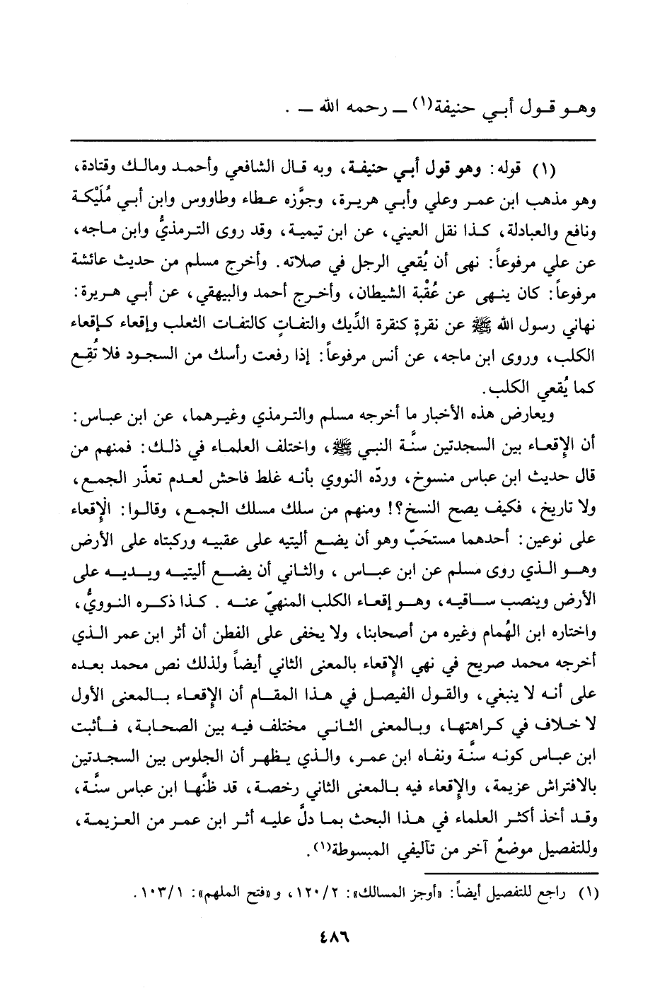 (¬1) قوله: وهو قول أبي حنيفة، وبه قال الشافعي وأحمد ومالك وقتادة، وهو مذهب ابن عمر وعلي وأبي هريرة، وجوَّزه عطاء وطاووس وابن أبي مُلَيكة ونافع والعبادلة، كذا نقل العيني، عن ابن تيمية، وقد روى الترمذيُّ وابن ماجه عن علي مرفوعاً: نهى أن يُقعي الرجل في صلاته، وأخرج مسلم من حديث عائشة مرفوعاً: كان ينهى عن عُقبة الشيطان، وأخرج أحمد والبيهقي، عن أبي هريرة: نهاني رسول الله صلى الله عليه وسلم عن نقرةٍ كنقرة الدِّيك والتفاتٍ كالتفات الثعلب وإقعاء كإقعاء الكلب، وروى ابن ماجه، عن أنس مرفوعاً: إذا رفعت رأسك من السجود فلا تُقِع كما يُقعي الكلب.