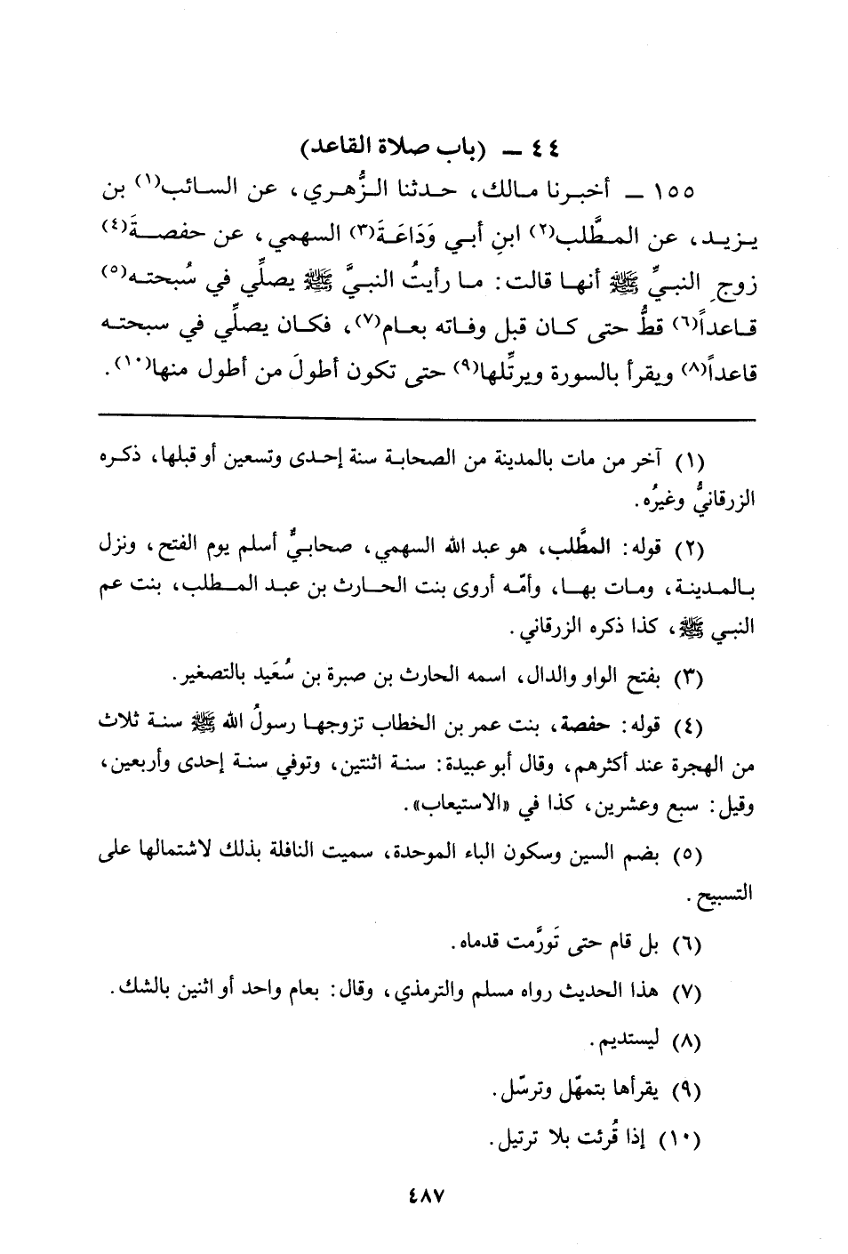 155 - أَخْبَرَنَا مَالِكٌ، حَدَّثَنَا الزُّهري، عَنِ السَّائِبِ (¬1) بْنِ يَزِيدَ، عَنِ المطَّلب (¬2) بْنِ أَبِي وَدَاعَةَ (¬3) السَّهْمِيِّ، عَنْ حفصةَ (¬4) زَوْجِ النبيِّ صَلَّى اللَّهُ عَلَيْهِ وَسَلَّمَ أَنَّهَا قَالَتْ: مَا رَأَيْتُ النبيَّ صَلَّى اللَّهُ عَلَيْهِ وَسَلَّمَ يُصَلِّي فِي سُبحته (¬5) قَاعِدًا (¬6) قطُّ حَتَّى كَانَ قَبْلَ وَفَاتِهِ بِعَامٍ (¬7) ، فَكَانَ يصلِّي فِي سُبْحَتِهِ قَاعِدًا (¬8) وَيَقَرْأُ بِالسُّورَةِ ويرتِّلها (¬9) حَتَّى تَكُونَ أطولَ مِنْ أطول منها (¬10) .