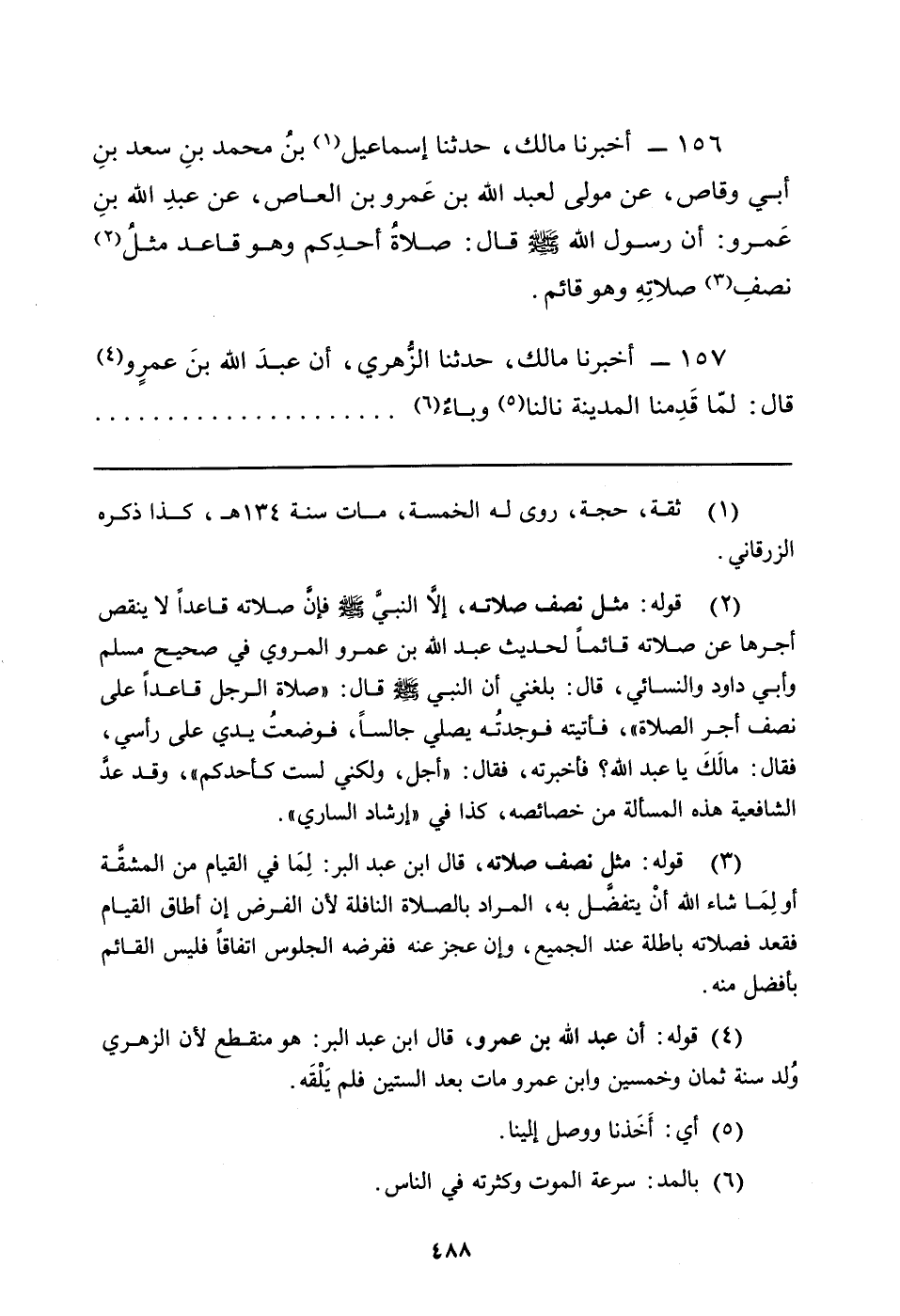 156 - أَخْبَرَنَا مَالِكٌ، حَدَّثَنَا إِسْمَاعِيلُ (¬1) بنُ مُحَمَّدِ بنِ سَعْدِ بنِ أَبِي وَقَّاصٍ، عَنْ مَوْلَى لِعَبْدِ اللَّهِ بْنِ عَمرو بْنِ الْعَاصِ، عَنْ عبدِ اللَّهِ بنِ عَمرو: أَنّ رَسُولَ اللَّهِ صَلَّى اللَّهُ عَلَيْهِ وَسَلَّمَ قَالَ: صلاةُ أحدِكم وَهُوَ قَاعِدٌ مثلُ (¬2) نصفِ (¬3) صلاتِهِ وَهُوَ قَائِمٌ.