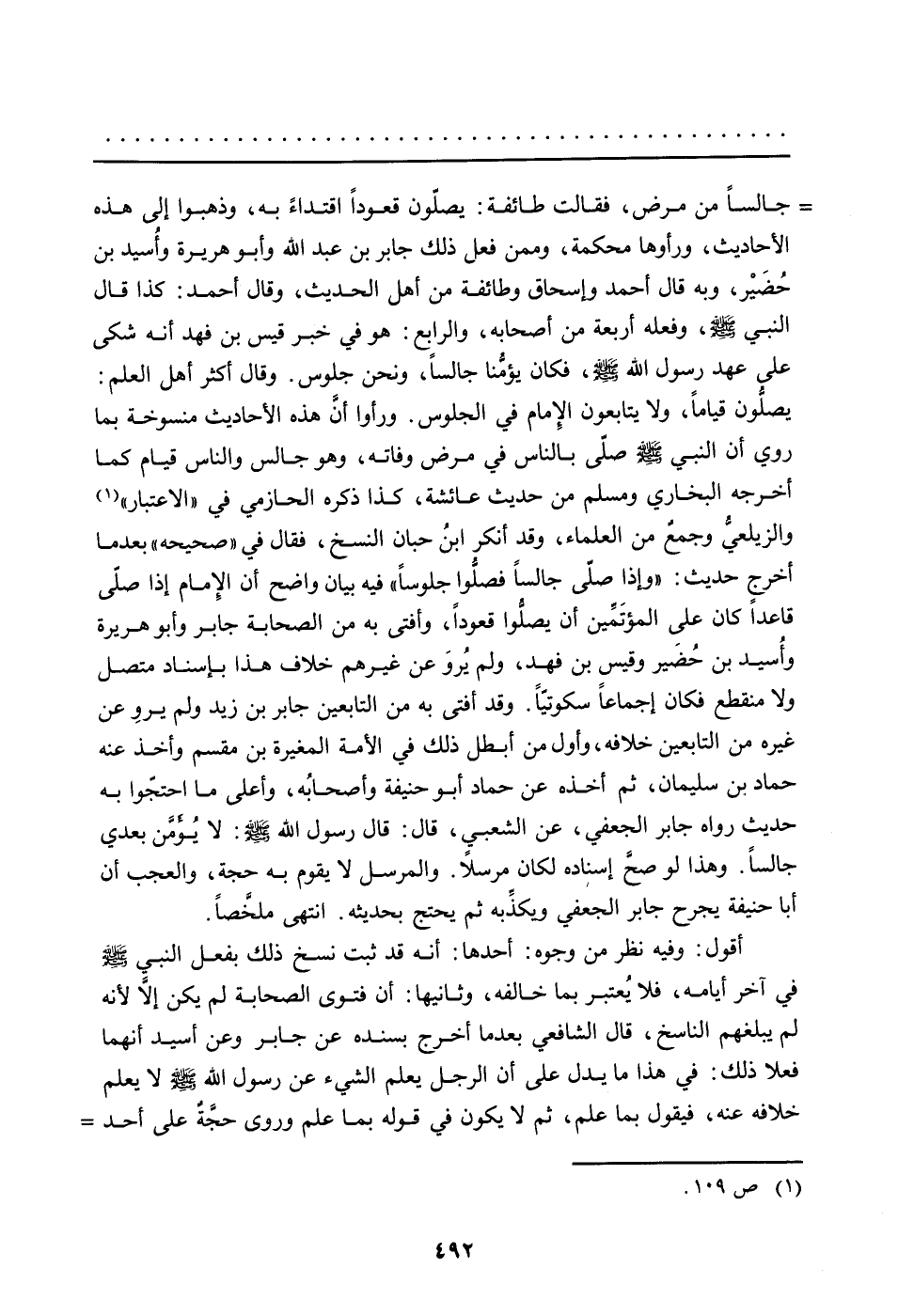 جالساً من مرض، فقالت طائفة: يصلّون قعوداً اقتداءً به، وذهبوا إلى هذه الأحاديث، ورأوها محكمة، وممن فعل ذلك جابر بن عبد الله وأبو هريرة وأُسيد بن حُضَير، وبه قال أحمد وإسحاق وطائفة من أهل الحديث، وقال أحمد: كذا قال النبي صلى الله عليه وسلم، وفعله أربعة من أصحابه، والرابع: هو في خبر قيس بن فهد أنه شكى على عهد رسول الله صلى الله عليه وسلم، فكان يؤمُّنا جالساً، ونحن جلوس. وقال أكثر أهل العلم: يصلُّون قياماً، ولا يتابعون الإمام في الجلوس. ورأوا أنَّ هذه الأحاديث منسوخة بما روي أن النبي صلى الله عليه وسلم صلّى بالناس في مرض وفاته، وهو جالس والناس قيام كما أخرجه البخاري ومسلم من حديث عائشة، كذا ذكره الحازمي في "الاعتبار" (ص 109) والزيلعيُّ وجمعٌ من العلماء، وقد أنكر ابنُ حبان النسخ، فقال في "صحيحه" بعد ما أخرج حديث: "وإذا صلّى جالساً فصلُّوا جلوساً" فيه بيان واضح أن الإمام إذا صلّى قاعداً كان على المؤتَمِّين أن يصلُّوا قعوداً، وأفتى به من الصحابة جابر وأبو هريرة وأُسيد بن حُضَير وقيس بن فهد، ولم يُروَ عن غيرهم خلاف هذا بإسناد متصل ولا منقطع فكان إجماعاً سكوتيّاً. وقد أفتى به من التابعين جابر بن زيد ولم يروِ عن غيره من التابعين خلافه، وأول من أبطل ذلك في الأمة المغيرة بن مقسم وأخذ عنه حماد بن سليمان، ثم أخذه عن حماد أبو حنيفة وأصحابُه، وأعلى ما احتجوا به حديث رواه جابر الجعفي، عن الشعبي، قال: قال رسول الله صلى الله عليه وسلم: لا يُؤّمَّن بعدي جالساً. وهذا لو صحَّ إسناده لكان مرسلاً. والمرسل لا يقوم به حجة، والعجب أن أبا حنيفة يجرح جابر الجعفي ويكذِّبه ثم يحتج بحديثه. انتهى ملخصاً.