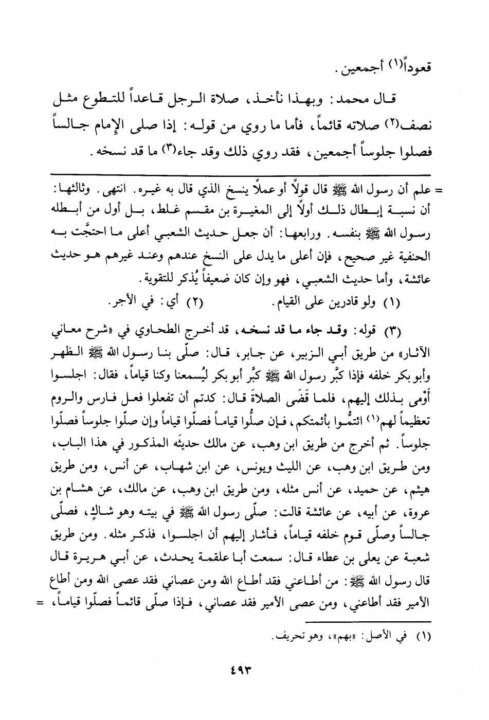 قَالَ مُحَمَّدٌ: وَبِهَذَا نَأْخُذُ، صَلاةُ الرَّجُلِ قَاعِدًا لِلتَّطَوُّعِ مِثْلُ نِصْفِ (¬2) صَلاتِهِ قَائِمًا، فَأَمَّا مَا رُوِيَ مِنْ قَوْلِهِ: إِذَا صَلَّى الإِمَامُ جَالِسًا فَصَلُّوا جُلُوسًا أَجْمَعِينَ، فَقَدْ رُوِيَ ذلك وقد جاء (¬3) ما قد نسخه.