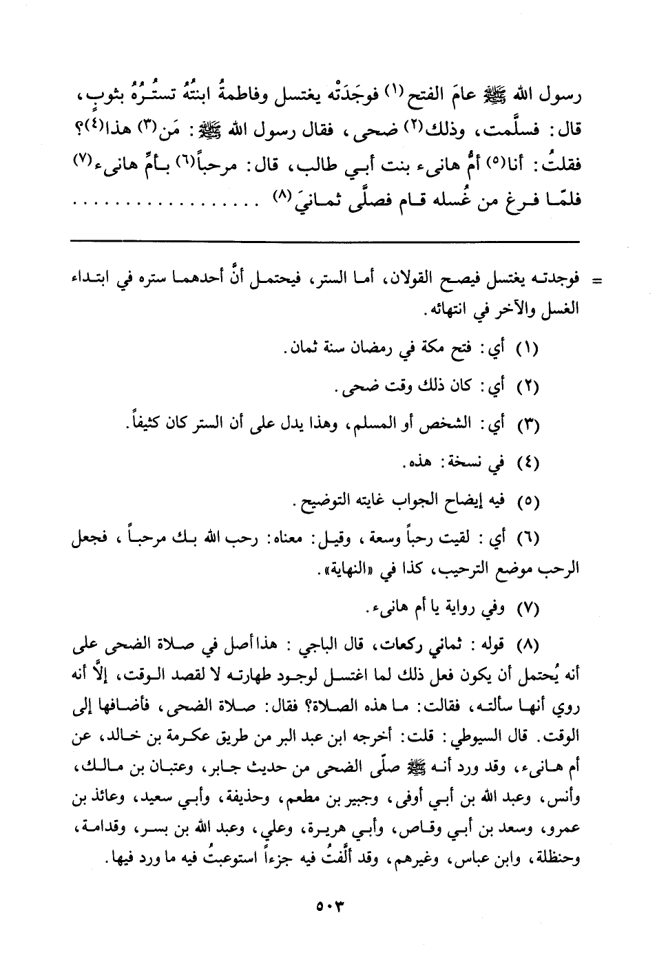 رسول الله صلى الله عليه وسلم عامَ الْفَتْحِ (¬1) فوجَدَتْه يَغْتَسِلُ وفاطمةُ ابنتُهُ تستُرُهُ بثوبٍ، قَالَ: فسلَّمت، وَذَلِكَ (¬2) ضُحَى، فَقَالَ رَسُولُ اللَّهِ صَلَّى اللَّهُ عَلَيْهِ وَسَلَّمَ: مَنْ (¬3) هَذَا (¬4) ؟ فقلتُ: أَنَا (¬5) أمُّ هَانِئِ بِنْتُ أَبِي طَالِبٍ، قَالَ: مَرْحَبًا (¬6) بأمِّ هَانِئِ (¬7) فَلَمَّا فَرَغَ مِنْ غُسله قام فصلَّى ثمانيَ (¬8)
