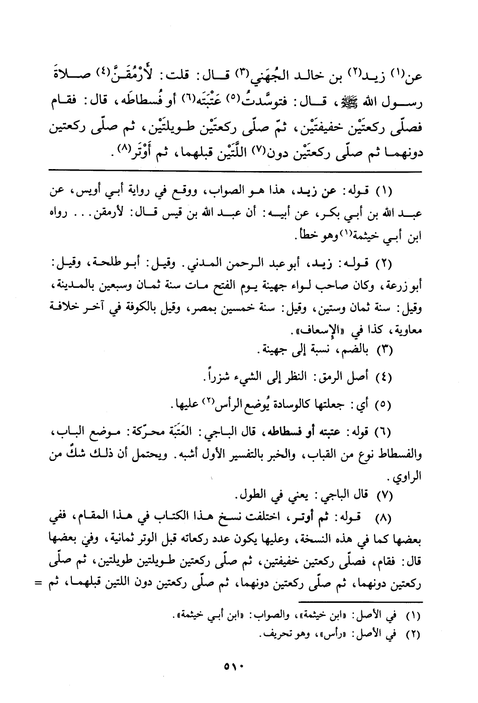 عَنْ (¬1) زَيْدِ (¬2) بْنِ خَالِدٍ الجُهَني (¬3) قَالَ: قُلْتُ: لأَرْمُقَنَّ (¬4) صلاةَ رَسُولِ اللَّهِ صَلَّى اللَّهُ عَلَيْهِ وَسَلَّمَ، قَالَ: فتوسَّدتُ (¬5) عَتْبَته (¬6) أَوْ فُسطاطَه، قَالَ: فقام فصلّى ركعتَيْن خفيفتَنْن، ثُمَّ صَلَّى ركعَتَيْن طويلتَيْن، ثُمَّ صَلَّى رَكْعَتَيْنِ دُونَهُمَا ثُمَّ صَلَّى ركعتَين دُونَ (¬7) اللَّتَيْن قَبْلَهُمَا، ثم أَوْتَر (¬8) .