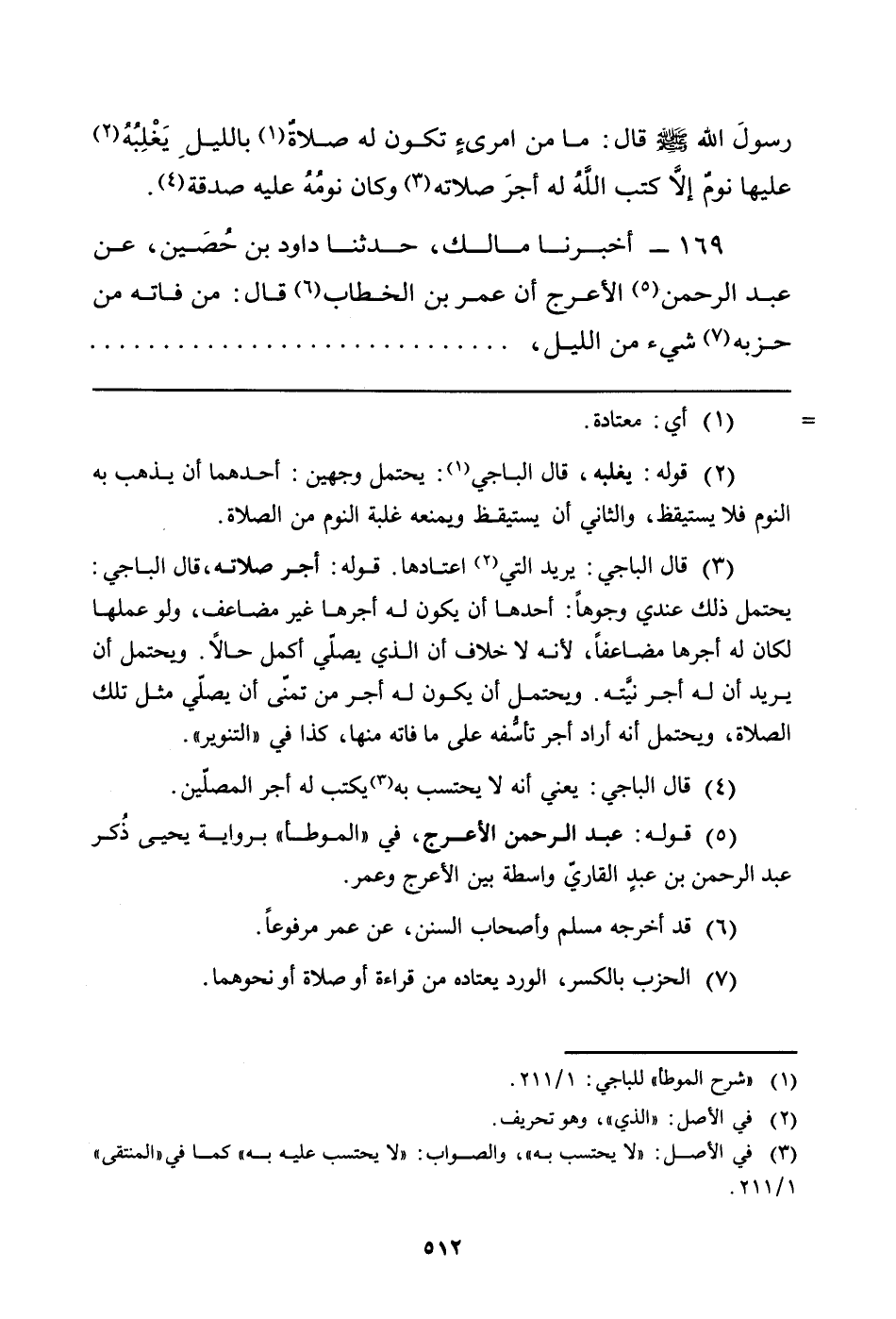 169 - أَخْبَرَنَا مَالِكٌ، حَدَّثَنَا دَاوُدُ بْنُ حُصَين، عَنْ عَبْدِ الرَّحْمَنِ (¬5) الأَعْرَجِ أَنَّ عُمَرَ بْنَ الْخَطَّابِ (¬6) قَالَ: مَنْ فَاتَهُ مِنْ حِزْبِهِ (¬7) شَيْءٌ مِنَ اللَّيْلِ،