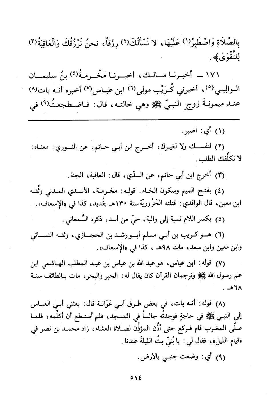 171 - أَخْبَرَنَا مَالِكٌ، أَخْبَرَنَا مَخْرمةُ (¬4) بنُ سُلَيْمَانَ الوالِبي (¬5) ، أَخْبَرَنِي كُرَيْب مَوْلَى (¬6) ابْنِ عَبَّاسٍ (¬7) أَخْبَرَهُ أَنَّهُ بَاتَ (¬8) عِنْدَ ميمونةَ زوجِ النَّبِيِّ صَلَّى اللَّهُ عَلَيْهِ وَسَلَّمَ وَهِيَ خَالَتُهُ، قَالَ: فاضطجعتُ (¬9) فِي