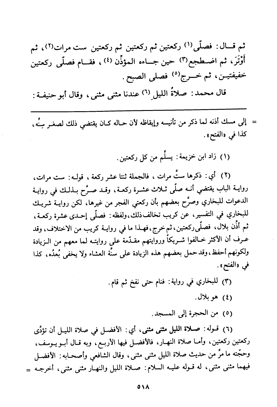 قَالَ مُحَمَّدٌ: صلاةُ الليلِ (¬6) عِنْدَنَا مَثْنَى مَثْنَى، وَقَالَ أَبُو حَنِيفَةَ: