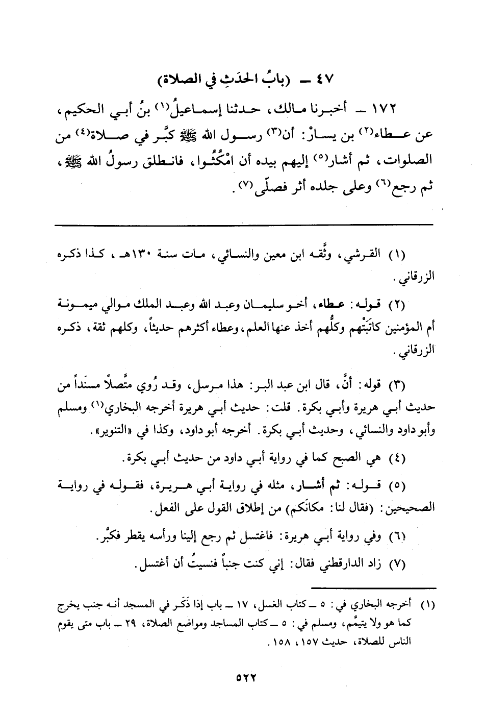 172 - أَخْبَرَنَا مَالِكٌ، حَدَّثَنَا إسماعيلُ (¬1) بنُ أَبِي الْحَكِيمِ، عَنْ عَطَاءِ (¬2) بْنِ يسارْ: أَنَّ (¬3) رَسُولَ اللَّهِ صَلَّى اللَّهُ عَلَيْهِ وَسَلَّمَ كبَّر فِي صَلاةٍ (¬4) مِنَ الصَّلَوَاتِ، ثُمَّ أَشَارَ (¬5) إِلَيْهِمْ بِيَدَهِ أَنِ امْكُثُوا، فَانْطَلَقَ رسولُ اللَّهِ صَلَّى اللَّهُ عَلَيْهِ وَسَلَّمَ، ثُمَّ رَجَعَ (¬6) وَعَلَى جِلْدِهِ أَثَرٌ فصلَّى (¬7) .