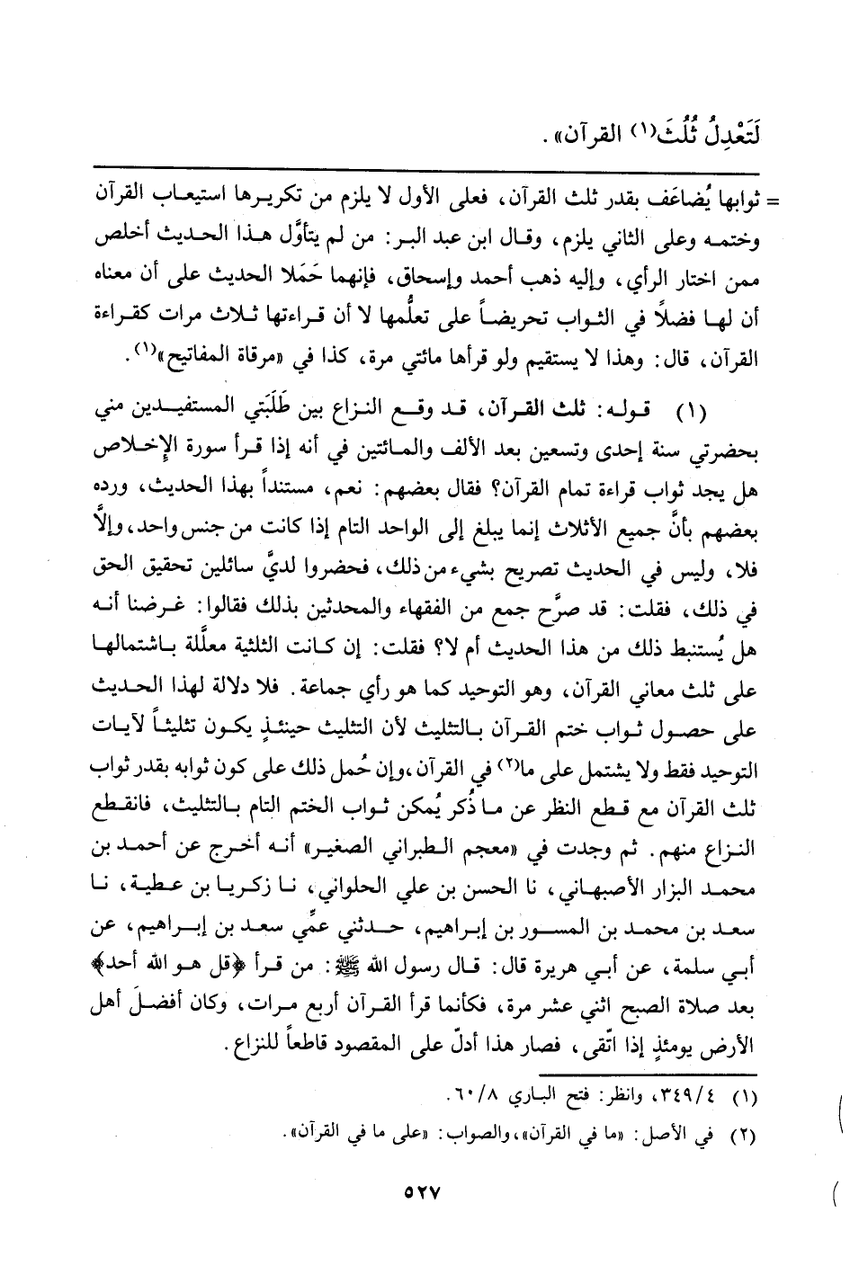 (¬1) قوله: ثلث القرآن، قد وقع النزاع بين طَلَبَتي المستفيدين مني بحضرتي سنة إحدى وتسعين بعد الألف والمائتين في أنه إذا قرأ سورة الإخلاص هل يجد ثواب قراءة تمام القرآن؟ فقال بعضهم: نعم، مستنداً بهذا الحديث، ورده بعضهم بأن جميع الأثلاث إنما يبلغ إلى الواحد التام إذا كانت من جنس واحد، وإلا فلا، وليس في الحديث تصريح بشيء من ذلك، فحضروا لديّ سائلين تحقيق الحق في ذلك، فقلت: قد صرّح جمع من الفقهاء والمحدثين بذلك فقالوا: غرضنا أنه هل يُستنبط ذلك من هذا الحديث أم لا؟ فقلت: إن كانت الثلثية معللة باشتمالها على ثلث معاني القرآن، وهو التوحيد كما هو رأي جماعة. فلا دلالة لهذا الحديث على حصول ثواب ختم القرآن بالتثليث لأن التثليث حينئذٍ يكون تثليثاً لآيات التوحيد فقط ولا يشتمل على ما (في الأصل: "ما في القرآن"، والصواب: "على ما في القرآن") في القرآن، وإن حُمل ذلك على كون ثوابه بقدر ثواب ثلث القرآن مع قطع النظر عن ما ذكر يمكن ثواب الختم التام بالتثليث، فانقطع النزاع منهم. ثم وجدت في "معجم الطبراني الصغير "أنه أخرج عن أحمد بن محمد البزار الأصبهاني، نا الحسن بن علي الحلواني، نا زكريا بن عطية، نا سعد بن محمد بن المسور بن إبراهيم، حدثني عمي سعد بن إبراهيم، عن أبي سلمة، عن أبي هريرة قال: قال رسول الله صلى الله عليه وسلم: من قرأ {قل هو الله أحد} بعد صلاة الصبح اثني عشر مرة، فكأنما قرأ القرآن أربع مرات، وكان أفضل أهل الأرض يومئذٍ إذا اتقى، فصار هذا أدل على المقصود قاطعاً للنزاع.