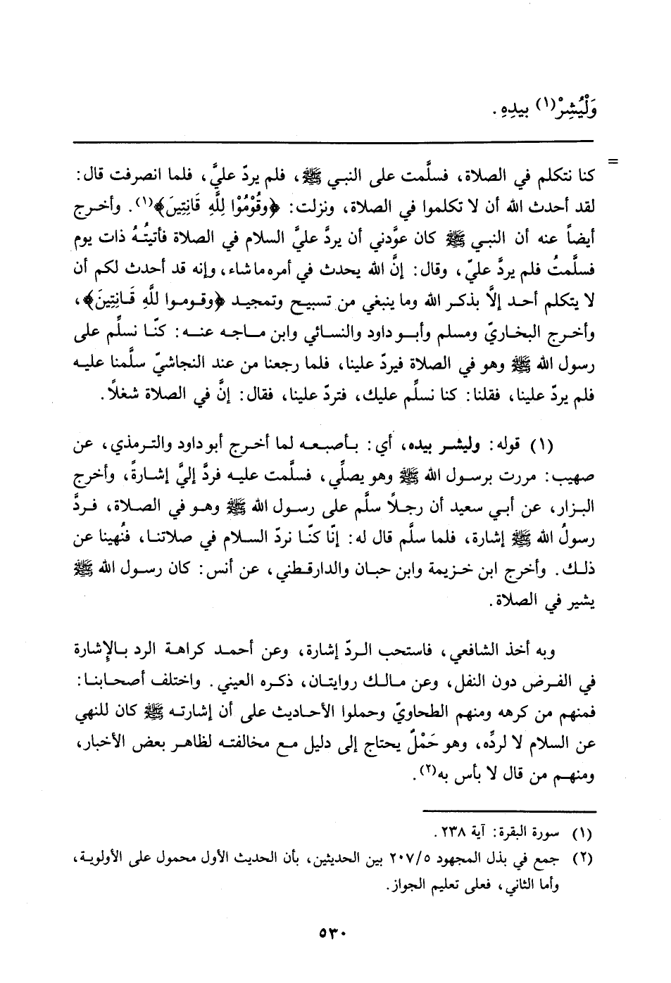 كنا نتكلم في الصلاة، فسلَّمت على النبي صلى الله عليه وسلم، فلم يردّ عليَّ، فلما انصرفت قال: لقد أحدث الله أن لا تكلموا في الصلاة، ونزلت: {وقُومُوا لِلَّهِ قَانِتِين} (سورة البقرة: آية 238) . وأخرج أيضاً عنه أن النبي صلى الله عليه وسلم كان عوّدني أن يردَّ عليَّ السلام في الصلاة فأتيتُهُ ذات يوم فسلَّمت فلم يردَّ عليّ، وقال: إنَّ الله يحدث في أمره ما شاء، وإنه قد أحدث لكم أن لا يتكلم أحد إلا بذكر الله وما ينبغي من تسبيح وتمجيد {وقوموا للَّهِ قَانِتِينَ} ، وأخرج البخاريّ ومسلم وأبو داود والنسائي وابن ماجه عنه: كنا نسلِّم على رسول الله صلى الله عليه وسلم وهو في الصلاة فيرد علينا، فلما رجعنا من عند النجاشي سلَّمنا عليه فلم يردّ علينا، فقلنا: كنا نسلِّم عليك، فتردّ علينا، فقال: إنَّ في الصلاة شغلاً.