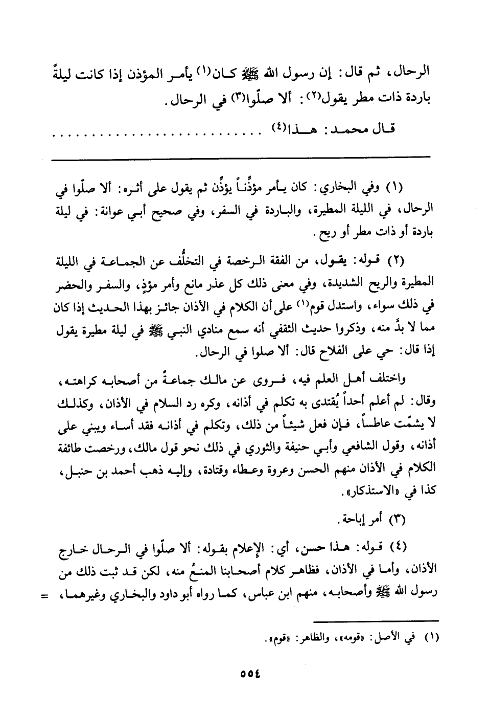 (¬1) وفي البخاري: كان يأمر مؤذِّناً يؤذِّن ثم يقول على أثره: ألا صلّوا في الرحال، في الليلة المطيرة، والباردة في السفر، وفي صحيح أبي عوانة: في ليلة باردة أو ذات مطر أو ريح.