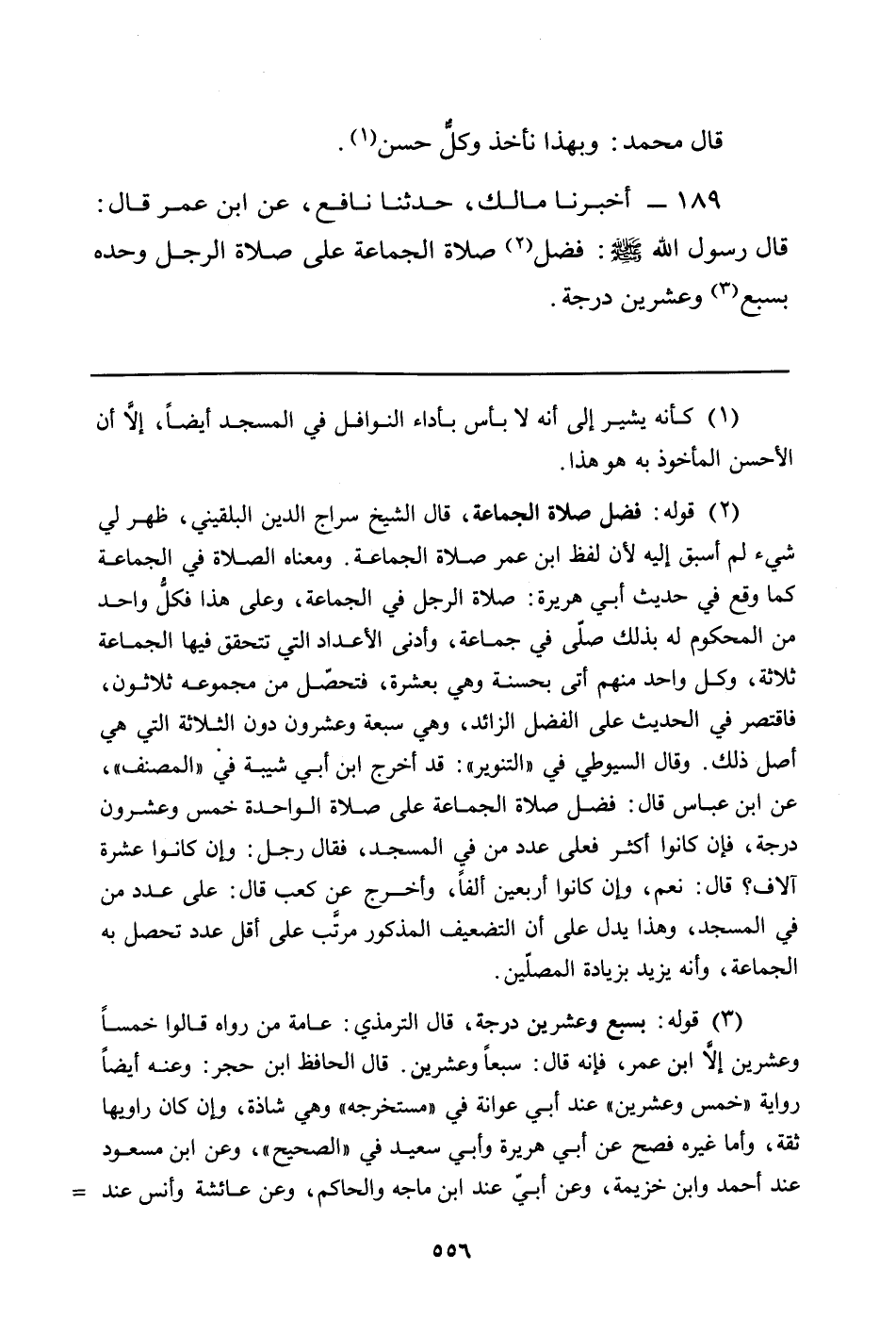 189 - أَخْبَرَنَا مَالِكٌ، حَدَّثَنَا نَافِعٌ، عَنِ ابْنِ عُمَرَ قَالَ: قَالَ رَسُولُ اللَّهِ صَلَّى اللَّهُ عَلَيْهِ وَسَلَّمَ: فَضْلُ (¬2) صَلاةِ الْجَمَاعَةِ عَلَى صَلاةِ الرَّجُلِ وَحْدَهُ بسبع (¬3) وعشرين درجة.