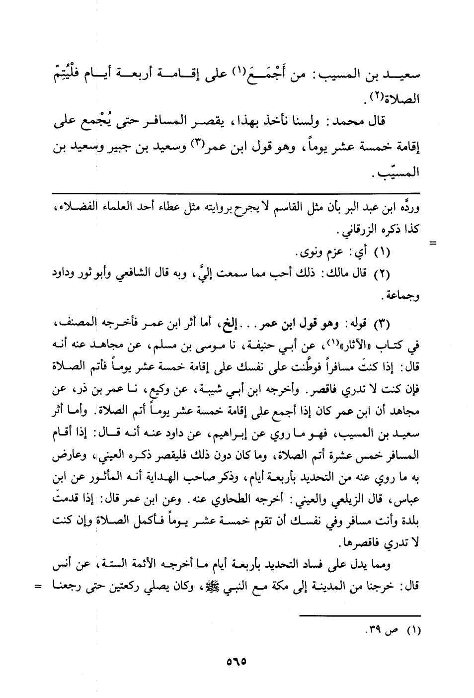 (¬3) قوله: وهو قول ابن عمر ... إلخ، أما أثر ابن عمر فأخرجه المصنف، في كتاب "الآثار" (ص 39) ، عن أبي حنيفة، نا موسى بن مسلم، عم مجاهد عنه أنه قال: إذا كنتَ مسافراً فرطَّنت على نفسك على إقامة خمسة عشر يوماً فأتم الصلاة فإن كنت لا تدري فاقصر. وأخرجه ابن أبي شيبة، عن وكيع، نا عمر بن ذر، عن مجاهد أن ابن عمر كان إذا أجمع على إقامة خمسة عشر يوماً أتم الصلاة. وأما أثر سعيد بن المسيب، فهر ما روى عن إبراهيم، عن داود عنه أنه قال: إذا أقام المسافر خمس عشرة أتم الصلاة، وما كان دون ذلك فليقصر ذكره العيني، وعارض به ما روي عنه من التحديد بأربعة أيام، وذكر صاحب الهداية أنه المأثور عن ابن عباس، قال الزيلعي والعيني: أخرجه الطحاوي عنه. وعن ابن عمر قال: إذا قدمتَ بلدة وأنت مسافر وفي نفسك أن تقوم خمسة عشر يوماً فأكمل الصلاة وإن كنت لا تدري فاقصرها.