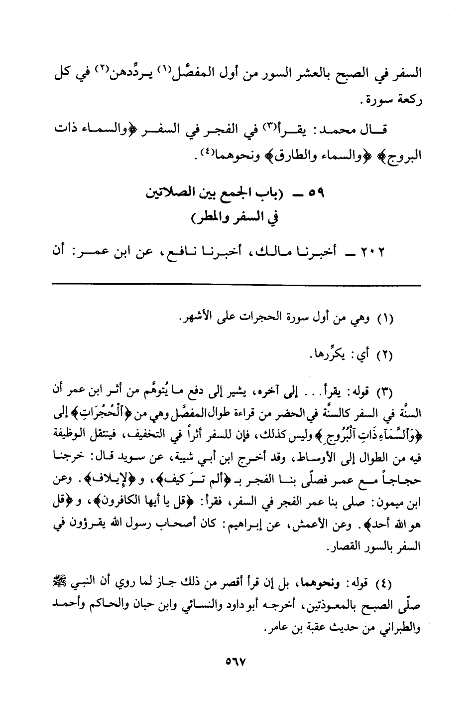 (¬3) قوله: يقرأ ... إلى أخره، يشير إلى دفع ما يُتوهَّم من أثر ابن عمر أن السنَّة في السفر كالسنَّة في الحضر من قراءة طوال المفصَّل وهو من {الحُجُرَاتِ} إلى {والسَّمَاءِ ذَاتِ البُروجِ} وليس كذلك، فإن للسفر أثراً في التخفيف، فينتقل الوظيفه فيه من الطوال إلى الأوساط، وقد أخرج ابن أبي شيبة، عن سويد قال: خرجنا حجاجاً مع عمر فصلّى بنا الفجر ب {ألم تر كيف} و {لإيلاف} وعن ابن ميمون صلى بنا عمر الفجر في السفر، فقرأ: {قل يا أيها الكافرون} ، و {قل هو الله أحد} . وعن الأعمش، عن أبراهيم: كان أصحاب رسول الله يقرؤون في السفر بالسور القصار.