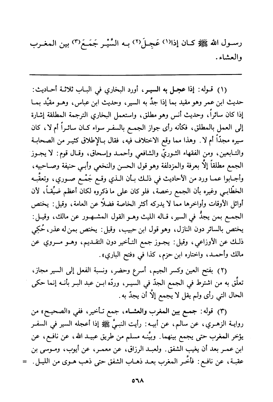 (¬3) قوله: جمع بين المغرب والعشاء، جمع تأخير، ففي "الصحيح" من رواية الزهري، عن سالم عن أبيه: رأيت النبيَّ صلى الله عليه وسلم إذا أعجله السير في السفر يؤخر المغرب حتى يجمع بينهما. وبيَّنه مسلم من طريق عبيد الله، عن نافع، عن ابن عمر بعد أن يغيب الشفق. ولعبد الرزاق، عن معمر، عن أيوب، وموسى بن عقبة، عن نافع: فأخَّر المغرب بعد ذهاب الشفق حتى ذهب هوى من الليل.