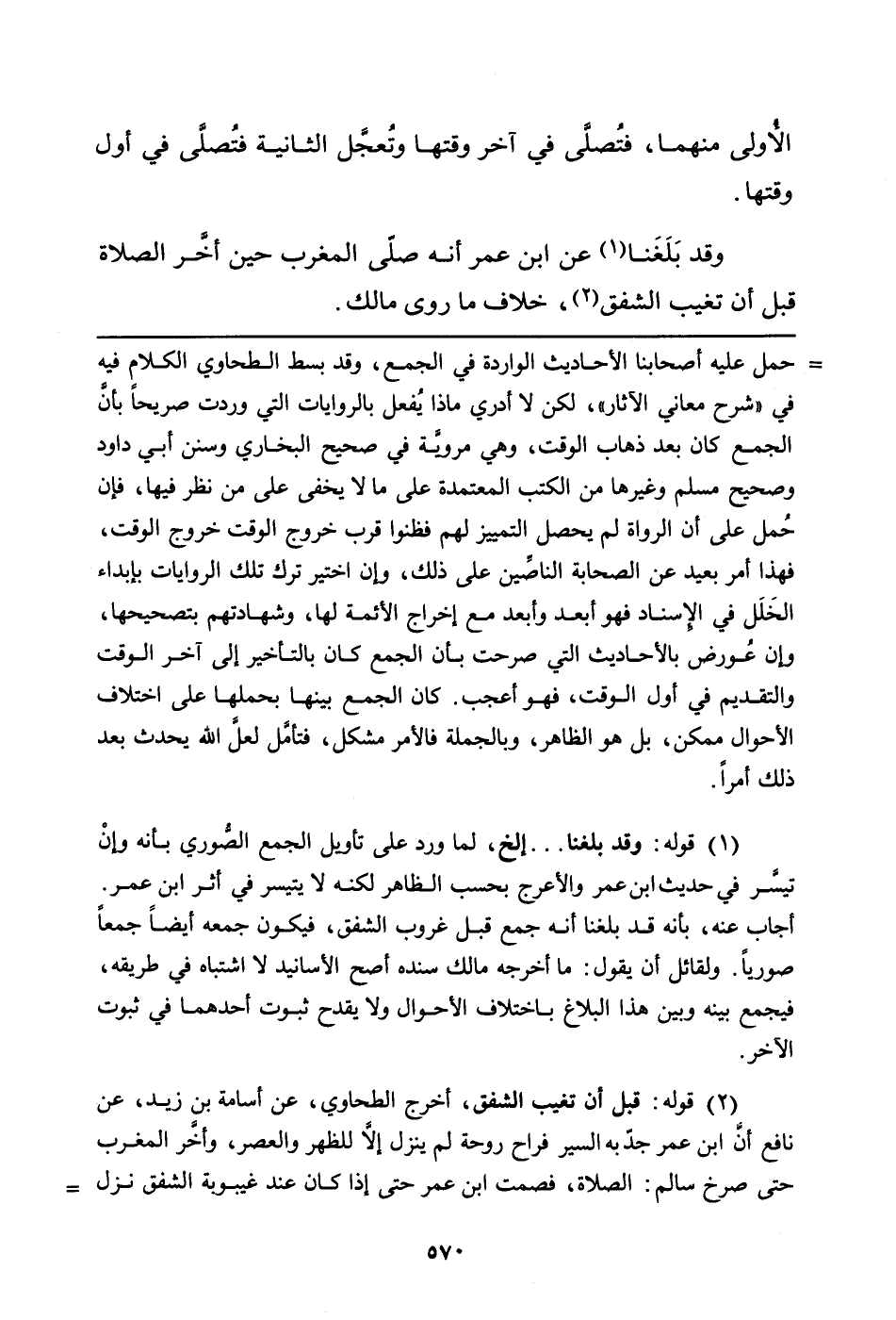 (¬1) قوله: وقد بلغنا ... إلخ، لما ورد على تأويل الجمع الصُّوري بأنه وإن تيسَّر في حديث ابن عمر والأعرج بحسب الظاهر لكنه لا يتيسر في أثر ابن عمر. أجاب عنه، بأنه قد بلغنا أنه جمع قبل غروب الشفق، فيكون جمعه أيضاً جمعاً صورياً، ولقائل أن يقول: ما أخرجه مالك سنده أصح الأسانيد لا اشتباه في طريقه، فيجمع بينه وبين هذا البلاغ باختلاف الأحوال ولا يقدح ثبوت أحدهما في ثبوت الآخر.