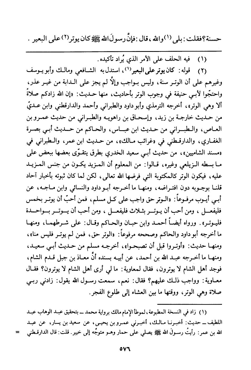 (¬2) قوله كان يوتر على البعير (زاد في النسخة المطبوعة، لموطأ الإمام مالك برواية محمد - بتحقيق عبد الوهاب عبد اللطيف - حديث: أخبرنا مالك، أخبرني عمرو بن يحيى، عن سعيد بن يسار، عن عبد الله بن عمر: رأيتُ رسول الله صلى الله عليه وسلم يصلي على حمار وهو متوجِّه إلى خيبر. قلت: قال الدارقطني وغيره: هذا غلط من عمرو بن يحيى المازني، إنما المعروف في صلاته صلى الله عليه وسلم على راحلته أو على البعير، انظر صحيح مسلم 2/352) ، استدل به الشافعي ومالك وأبو يوسف وغيرهم على أن الوتر سنة، وليس بواجب وإلا لم يجز على الدابة من غير عذر، واحتجّوا لأبي حنيفة في وجوب الوتر بأحاديث، منها حديث: "إن الله زادكم صلاةً ألا وهي الوتر"، أخرجه الترمذي وأبو داود والطبراني وأحمد والدارقطني وابن عديّ من حديث خارجة بن زيد، وإسحاق بن راهويه والطبراني من حديث عمرو بن العاص، والطبراني من حديث ابن عباس، والحاكم من حديث أبي بصرة الغفاري، والدارقطني في "غرائب مالك"، من حديث ابن عمر، والطبراني في "مسند الشاميين"، من حديث أبي سعيد الخدري بطرق يتقوّى بعضها ببعض عل ما بسطه الزيلعي وغيره، قالوا: من المعلوم أن المزيد يكون من جنس المزيد عليه، فيكون الوتر كالمكتوبة التي فرضها الله تعالى، لكن لما كان ثبوته بأخبار آحاد قلنا بوجوبه دون افتراضه، ومنها ما أخرجه أبو داود والنسائي وابن ماجه، عن أبي أيوب مرفوعاً: "الوتر حق واجب على كل مسلم، فمن أحبّ أن يوتر بخمس فليفعل، ومن أحب أن يوتر بثلاث فليفعل، ومن أحب أن يوتر بواحدة فليوتر". ورواه أيضاً أحمد وابن حبان والحاكم وقال: على شرطهما، ومنها ما أخرجه أبو داود والحاكم وصححه مرفوعاً: "الوتر حق، فمن لم يوتر فليس منا"، ومنها حديث: "أوتروا قبل أن تصبحوا"، أخرجه مسلم من حديث أبي سعيد، ومنها ما أخرجه عبد الله بن أحمد، عن أبيه بسنده أنَّ معاذ بن جبل قدم الشام، فوجد أهل الشام لا يوترون، فقال لمعاوية: ما لي أرى أهل الشام لا يوترون؟ فقال معاوية: وواجب ذلك عليهم؟ فقال: نعم، سمعت رسول الله يقول: زادني ربي صلاة وهي الوتر، ووقتها ما بين العشاء إلى طلوع الفجر.