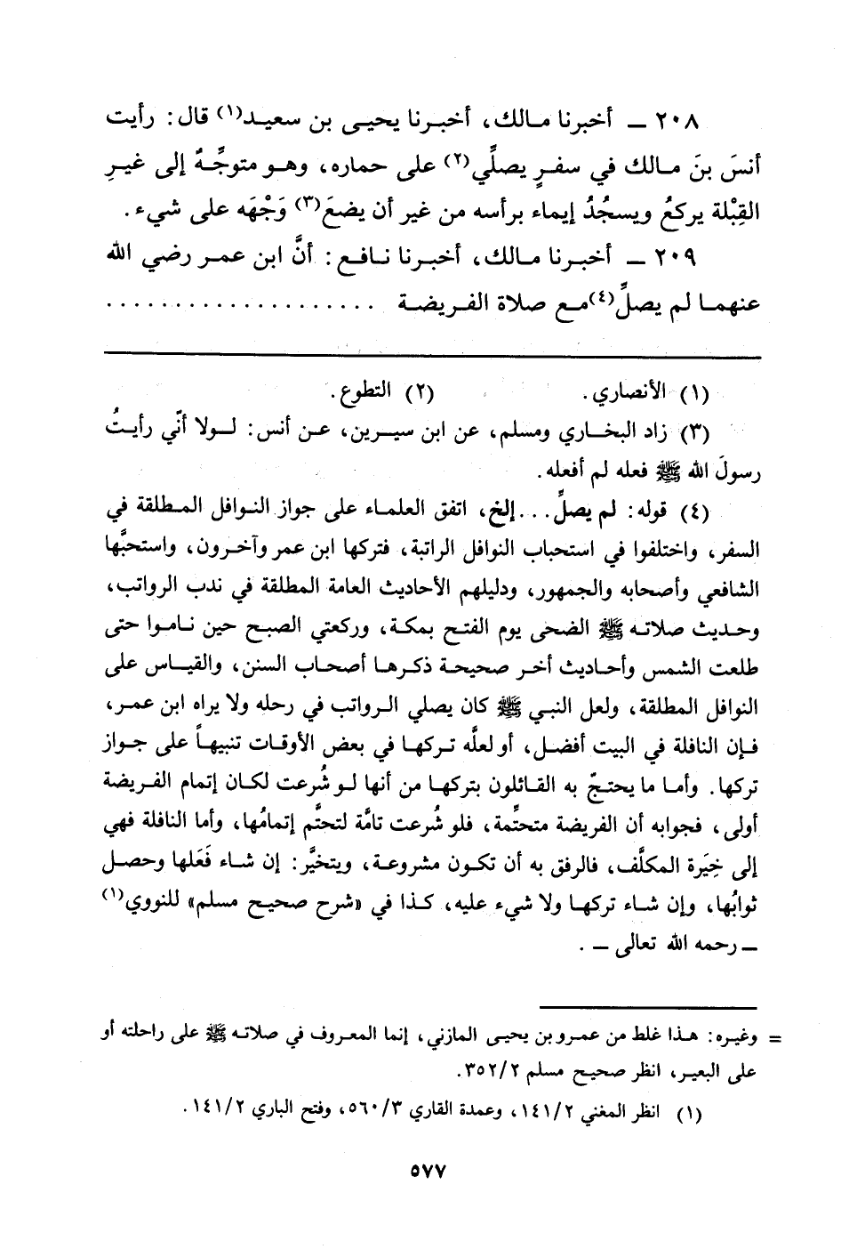 208 - أَخْبَرَنَا مَالِكٌ، أَخْبَرَنَا يَحْيَى بْنُ سَعِيدٍ، (¬1) قَالَ: رأيت أنس ابن مَالِكٍ فِي سَفَرٍ يُصَلِّي (¬2) عَلَى حِمَارِهِ، وَهُوَ مُتَوَجِّهٌ إِلَى غَيْرِ الْقِبْلَةِ يَرْكَعُ وَيَسْجُدُ إِيمَاءً بِرَأْسِهِ مِنْ غَيْرِ أَنْ يَضَعَ وَجْهَهُ عَلَى شَيْءٍ (¬3) .