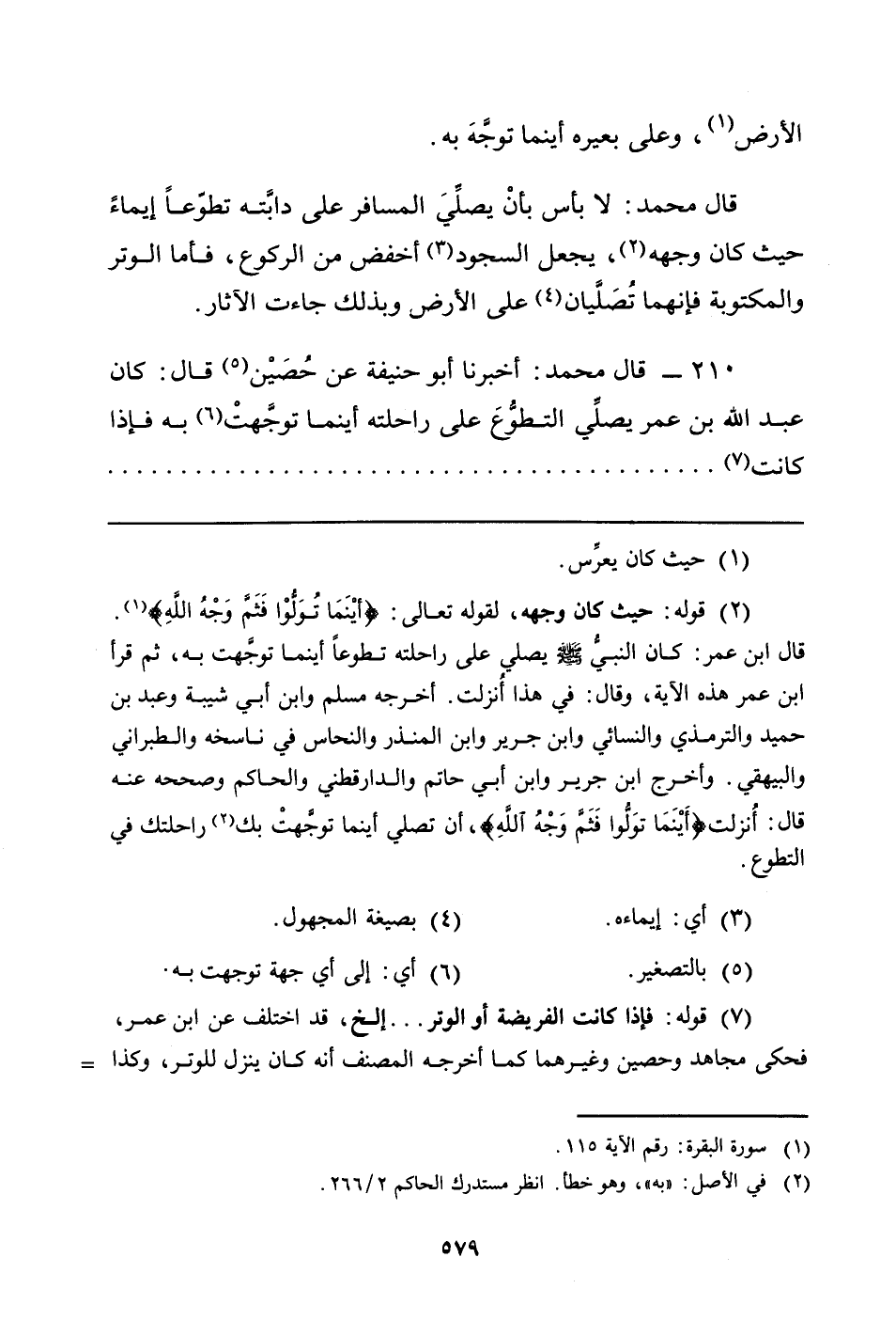 210 - قَالَ مُحَمَّدٌ: أَخْبَرَنَا أَبُو حَنِيفَةَ عَنْ حُصَيْنٍ (¬5) قَالَ: كَانَ عَبْدُ اللَّهِ بْنُ عُمَرَ يصلِّي التطُّوع عَلَى رَاحِلَتِهِ أينما توجَّهت (¬6) به فإذا كانت (¬7)