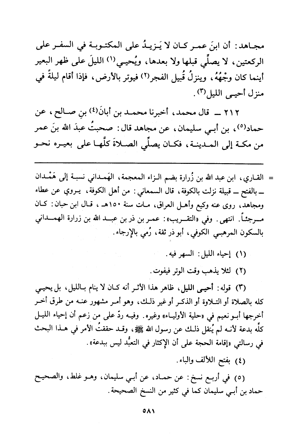 مُجَاهِدٍ: أَنَّ ابْنَ عُمَرَ كَانَ لا يَزِيدُ عَلَى الْمَكْتُوبَةِ فِي السَّفَرِ عَلَى الرَّكْعَتَيْنِ، لا يصلِّي قَبْلَهَا وَلا بَعْدَهَا، وَيُحْيِي (¬1) اللَّيْلَ عَلَى ظَهْرِ الْبَعِيرِ أَيْنَمَا كَانَ وَجْهُهُ، وَيَنْزِلُ قُبَيْلَ الْفَجْرِ (¬2) فَيُوتِرُ بِالأَرْضِ، فَإِذَا أَقَامَ لَيْلَةً فِي مَنْزِلٍ أَحْيَى اللَّيْلَ (¬3) .