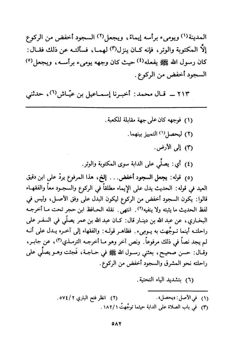 (¬5) قوله: يجعل السجود أخفض ... إلخ، هذا المرفوع يردّ على ابن دقيق العيد في قوله: الحديث يدل على الإيماء مطلقاً في الركوع والسجود معاً والفقهاء قالوا: يكون السجود أخفض من الركوع ليكون البدل على وفق الأصل، وليس في لفظ الحديث ما يثبته ولا ينفيه (انظر فتح الباري 2/574) . انتهى. نقله الحافظ عن ابن حجر تحت ما أخرجه البخاري، عن عبد الله بن دينار قال: كان عبد الله بن عمر يصلِّي في السفر على راحلته أينما توجهت به يومئ. فظاهر قوله: والفقهاء إلى آخره يدل على أنه لم يجد نصاً في ذلك مرفوعاً، ونص آخر وهو ما أخرجه الترمزي (في باب الصلاة على الدابة حيثما توجَّهت 1/182) ، عن جابر، وقال: حسن صحيح، بعثني رسول الله صلى الله عليه وسلم في حاجة، فجئت وهو يصلِّي على راحلته نحو المشرق والسجود أخفض من الركوع.