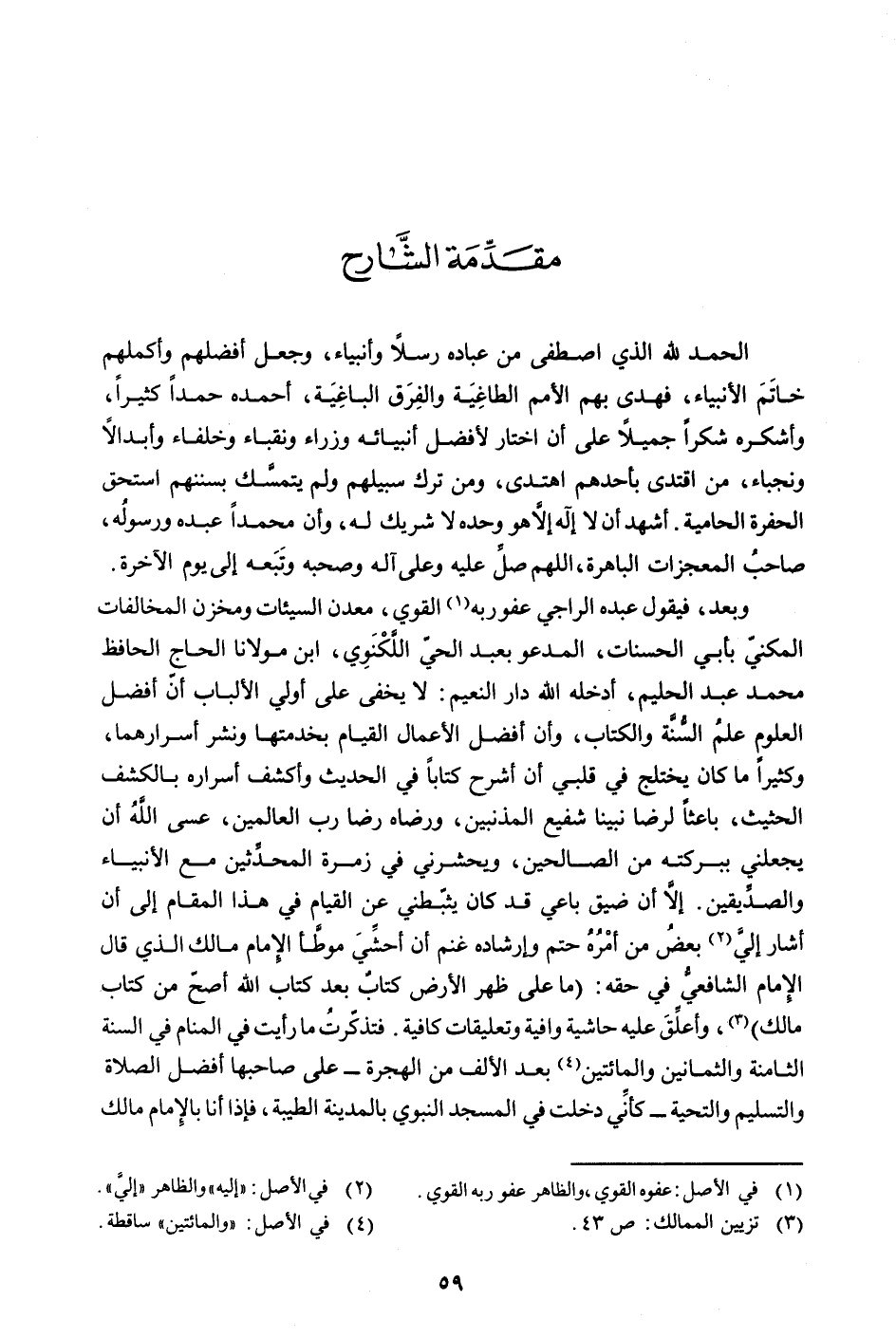 وبعد فيقول عبده الراجي عفو ربه (في الأصل: عفوه القوي، والظاهر عفو ربه القوي) القوي، معدن السيئات ومخزن المخالفات المكنّى بأبي الحسنات، المدعو بعبد الحي اللَّكنَوي، ابن مولانا الحاج الحافظ محمد عبد الحليم، أدخله الله دار النعيم: لا يخفى على أولي الألباب أنّ أفضل العلوم علمُ السُّنَّة والكتاب، وأن أفضل الأعمال القيام بخدمتها ونشر أسرارهما، وكثيراً ما كان يختلج في قلبي أن أشرح كتاباً في الحديث وأكشف أسراره بالكشف الحثيث، باعثاً لرضا نبينا شفيع المذنبين، ورضاه رضا رب العالمين، عسى الله أن يجعلني ببركته من الصالحين، ويحشرني في زمرة الحدِّثين مع الأنبياء والصديقين. إلاَّ أن ضيق باعي قد كان يثبّطني عن القيام في هذا المقام إلى أن أشار إلىَّ (في الأصل: "إليه" والظاهر "إليَّ") بعضُ من أمْرُهُ حتم وإرشاده غنم أن أحشِّيَ موطَّأ الإمام مالك الذي قال الإمام الشافعيُّ في حقه: (ما على ظهر الأرض كتابٌ بعد كتاب الله أصحّ من كتاب مالك) (تزيين الممالك: ص 43) ، وأعلق عليه حاشية وافية وتعليقات كافية. فتذكّرتُ ما رأيت في المنام في السنة الثامنة والثمانين والمائتين (في الأصل: "والمائتين" ساقطة) بعد الألف من الهجرة - على صاحبها أفضل الصلاة والتسليم والتحية - كأنِّي دخلت في المسجد النبوي بالمدينة الطيبة، فإذا أنا بالإمام مالك