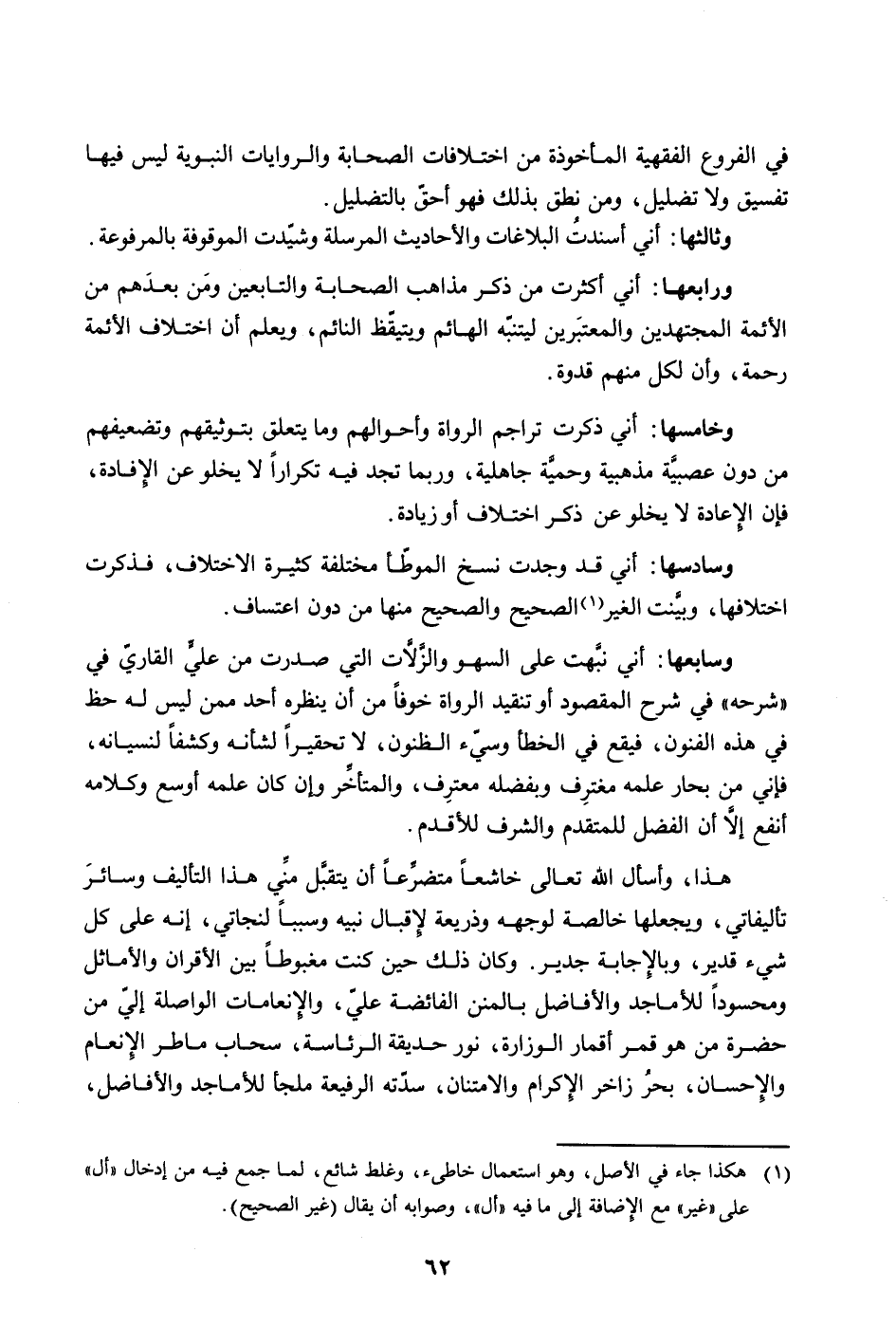 وسابعها: أني نبَّهت على السهو والزلاَّت التي صدرت من عليٍّ القاريّ في "شرحه" في شرح المقصود أو تنقيد الرواة خوفاً من أن ينظره أحد ممن ليس له حظ في هذه الفنون، فيقع في الخطأ وسيء الظنون، لا تحقيراً لشأنه وكشفاً لنسيانه، فإني من بحار علمه مغترِف وبفضله معترِف، والمتأخر وإن كان علمه أوسع وكلامه أنفع إلاَّ أن الفضل للمتقدم والشرف للأقدم.