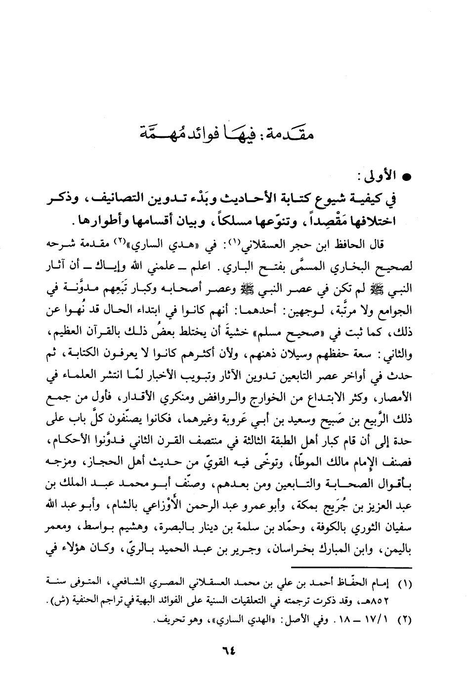 - قال الحافظ ابن حجر العسقلاني (إمام الحفّاظ أحمد بن علي بن محمد العسقلاني المصري الشافعي، المتوفى سنة 852 هـ وقد ذكرت ترجمته في التعلقيات السنية على الفوائد البهية في تراجم الحنفية (ش)) : في "هدي الساري" (1/17 - 18 وفي الأصل: "الهدي الساري" وهو تحريف) . مقدمة شرحه لصحيح البخاري المسمّى بفتح الباري. أعلم - علمني الله وإياك - أن آثار النبي صلى الله عليه وسلم لم تكن في عصر النبي صلى الله عليه وسلم وعصر أصحابه وكبار تَبَعِهم مدوّنة في الجوامع ولا مرتَّبة، لوجهين: أحدهما: أنهم كانوا في ابتداء الحال قد نُهوا عن ذلك، كما ثبت في "صحيح مسلم" خشية أن يختلط بعض ذلك بالقرآن العظيم، والثاني: سعة حفظهم وسيلان ذهنهم، ولأن أكثرهم كانوا لا يعرفون الكتابة، ثم حدث في أواخر عصر التابعين تدوين الآثار وتبويب الأخبار لمّا انتشر العلماء في الأمصار، وكثر الابتداع من الخوارج والروافض ومنكري الأقدار، فأول من جمع ذلك الربيع بن صبيح وسعيد بن أبي عَروبة وغيرهما، فكانوا يصنّفون كلّ باب على حدة إلى أن قام كبار أهل الطبقة الثالثة في منتصف القرن الثاني فدوّنوا الأحكام، فصنف الإمام مالك الموطأ، وتوخّى فيه القويّ من حديث أهل الحجاز، ومزجه بأقوال الصحابة والتابعين ومن بعدهم، وصنّف أبو محمد عبد الملك بن عبد العزيز بن جُريج بمكة، وأبو عمرو عبد الرحمن الأَوزاعي بالشام، وأبو عبد الله سفيان الثوري بالكوفة، وحماد بن سلمة بن دينار بالبصرة، وهشيم بواسط، ومعمر باليمن، وابن المبارك بخراسان، وجرير بن عبد الحميد بالريّ، وكان هؤلاء في