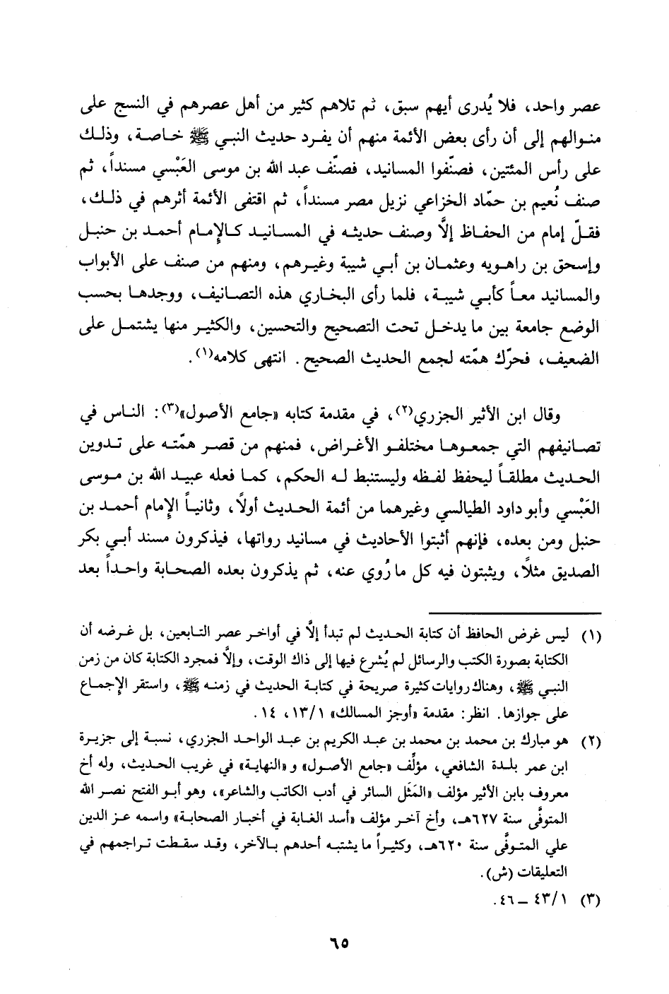 وقال ابن الأثير الجزري (هو مبارك بن محمد بن محمد بن عبد الكريم بن عبد الواحد الجزري، نسبة الى جزيرة ابن عمر بلدة الشافعي، مؤلف "جامع الأصول" و "النهاية" في غريب الحديث، وله أخ معروف بابن الأثير مؤلف "المثل السائر في أدب الكاتب والشاعر" وهو أبو الفتح نصر الله المتوفي سنة 627 هجري، وأخ آخر مؤلف "أسد الغابة في أخبار الصحابة" اسمة عز الدين علي المتوفي سنة 62. هجري، وكثيراً ما يشتبه أحدهم بالآخر، وقد سقطت تراجمهم في التعليقات (ش) ، في مقدمة كتابه "جامع الأصول" (1/43ـ46) : والناس في تصانيفهم التي جمعوها مختلفو الأغراض، فمنهم من قصر همته على تدوين الحديث مطلقا ليحفظ لفظه وليستنبط له الحكم، كما فعله عبيد الله بن موسى العبسي وأبو داود الطيالسي وغيرهما من أئمة الحديث أولاً، وثانياً الإمام أحمد بن حنبل ومن بعده، فإنهم أثبتوا الأحاديث في مسانيد رواتها، فيذكرون مسند أبي بكر الصديق مثلاً، ويثبتون فيه كل ما روي عنه، ثم يذكرون بعده الصحابة واحداً بعد