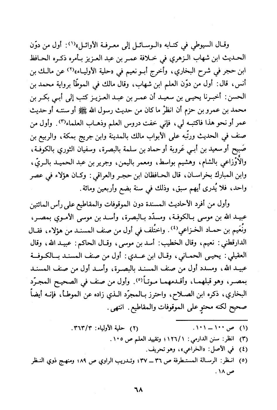 وقال السيوطي في كتابه "الوسائل إلى معرفة الاوائل" (ص 100 - 101) : أول من دون الحديث ابن شهاب الزهري في خلافة عمر بن عبد العزيز بأمره ذكره الحافظ ابن حجر في شرح البخاري، وأخرج أبو نعيم في"حلية الأولياء" (حلية الأولياء: 3/ 363) عن مالك بن أنس، قال: أول من دوّن العلم ابن شهاب، وقال مالك في الموطأ برواية محمد بن الحسن: أخبرنا يحيى بن سعيد بن عُمَرَ بْنَ عَبْدِ الْعَزِيزِ كَتَبَ إِلَى أَبِي بكر بن محمد بن عمرو بن حزم أن انْظُرْ مَا كَانَ مِنْ حَدِيثِ رَسُولِ اللَّهِ صَلَّى اللَّهُ عَلَيْهِ وَسَلَّمَ أَوْ سُنَّتِهِ أَوْ حَدِيثِ عُمَرَ أَوْ نَحْوِ هَذَا فَاكْتُبْهُ لِي، فإني خفت دروس العلم وذهاب العلماء (انظر سنن الدارمي: 1/126؛ وتقييد العلم ص 105) . وأول من صنف في الحديث ورتبه على الأبواب مالك في المدينة وابن جريج بمكة، والربيع بن صبيح أو سعيد بن أبي عروبة أو حماد بن سلمة بالبصرة، وسفيان الثوري بالكوفة، والأوزاعي بالشام، وهشيم بواسط، ومعمر باليمن، وجرير بن عبد الحميد بالريّ، وابن مبارك بخراسان، قال الحافظان بن حجر والعراقي: وكان هؤلاء في عصر واحد، فلا يدرى أيهم سبق، وذلك في سنة بضع وأربعين ومائة.