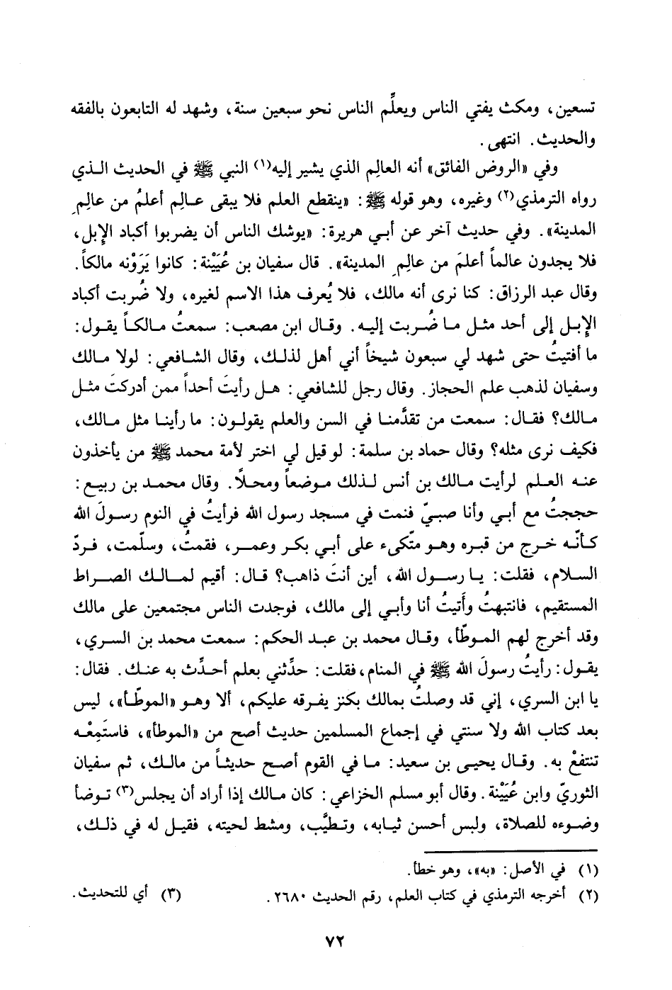 وفي "الروض الفائق" أنه العالم الذي يشير إليه (في الأصل: "به"، وهو خطأ) النبي صلى الله عليه وسلم في الحديث الذي رواه الترمزي (أخرجه الترمزي في كتاب العلم، رقم الحديث 2680) وغيره، وهو قوله صلى الله عليه وسلم: "ينقط العلم فلا يبقى عالم أعلم من عالم المدينة". وفي حديث آخر عن أبي هريرة: "يوشك الناس أن يضربوا أكباد الإبل، فلا يجدون عالماً أعلم من عالم المدينة". قال سفيان بن عيينة: كانوا يرون مالكاً، وقال عبد الرزاق: كنا نرى أنه مالك فلا يعرف هذا الإسم لغيره، ولا ضربت أكباد الإبل إلى أحد مثل ما ضربت إليه. وقال مصعب: سمعت مالكاً يقول: ما أفتيت حتى شهد لي سبعون شيخاً أني أهلٌ لذلك، وقال الشافعي: لولا مالك وسفيان لذهب علم الحجاز. وقال رجل للشافعي: هل رأيت أحداً ممن أدركت مثل مالك؟ فقال: سمعت من تقدّمنا في السن والعلم يقولون: ما رأينا مثل مالك، فكيف نرى مثله؟ وقال حماد بن سلمة: لو قيل لي اختر لأمة محمد صلى الله عليه وسلم من يأخذون عنه العلم لرأيت مالك بن أنس لذلك موضعاً ومحلاً. وقال محمد بن ربيع حججت مع أبي وأنا صبي فنمت في مسجد رسول الله فرأيت في النوم رسول الله كأنه خرج من قبره وهو متّكئ على أبي بكر وعمر، فقمت، وسلّمت، فردّ السلام، فقلت: يا رسول الله، أين أنت ذاهب؟ قال: أقيم لمالك الصراط المستقيم، فانتبهت وأتيت أنا وأبي إلى مالك، فوجدت الناس مجتمعين على مالك وقد أخرج لهم الموطّأ، وقال محمد بن عبد الحكيم: سمعت محمد بن السري، يقول: رَأَيْتُ رَسُولَ اللَّهِ صَلَّى اللَّهُ عَلَيْهِ وَسَلَّمَ في المنام، فقلت: حدّثني بعلم أحدّث به عنك. فقال: يا ابن السري، إني قد وصلت بمالك بكنز يفرقه عليكم، ألا وهو "الموطّأ"، ليس بعد كتاب الله ولا سنتي في إجماع المسلمين حديث أصح من "الموطأ"، فاستمعه تنتفع به. وقال يحيى بن سعيد: ما في القوم أصح حديثاً من مالك، ثم سفيان الثوريّ وابن عيينة. وقال أبو مسلم الخزاعي: كان مالك إذا أراد أن يجلس (أي للتحديث) توضأ وضوءه للصلاة، ولبس أحسن ثيابه، وتطيّب، ومشط لحيته، فقيل له في ذلك،