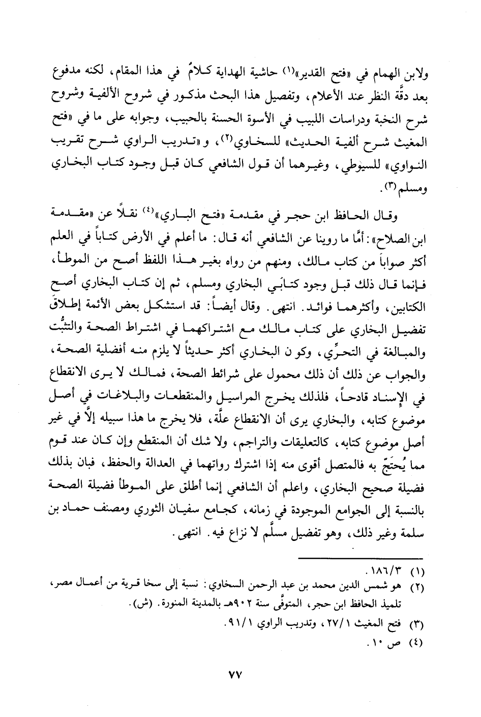 ولإبن الهمام في "فتح القدير" (3/186) حاشية الهداية كلام في هذا المقام، لكنه مدفوع بعد دقة النظر عند الأعلام، وتفصيل هذا البحث مذكور في شروح الألفية وشروح شرح النخبة ودراسات اللبيب في الأسوة الحسنة بالحبيب، وجوابه على ما في "فتح المغيث شرح ألفية الحديث" للسخاوي (هو شمس الدين محمد بن عبد الرحمن السخاوي: نسبة إلى سخا قرية من أعمال مصر، تلميذ الحافظ ابن حجر، المتوفى سنة 902 هـ بالمدينة المنورة. (ش)) ، و"تدريب الراوي شرح تقريب النواوي" للسيوطي، وغيرهما أن قول الشافعي كان قبل وجود كتاب البخاري ومسلم (فتح المغيث 1/27، وتدريب الراوي 1/91) . وقال الحافظ ابن حجر في مقدمة " فتح الباري" (ص 10) نقلاً عن"مقدمة ابن الصلاح": أما ما روينا عن الشافعي أنه قال: ما أعلم في الأرض كتاباً في العلم أكثر صوابا من كتاب مالك، ومنهم من رواه بغير هذا اللفظ أصح من الموطّأ، فإنما قال ذلك قبل وجود كتابي البخاري ومسلم، ثم أن كتاب البخاري أصح الكتابين، وأكثرهما فوائد. انتهى. وقال أيضاً: قد استشكل بعض الأئمة إطلاق تفضيل البخاري على كتاب مالك مع اشتراكهما في اشتراط الصحة والتثبّت والمبالغة في التحري، وكون البخاري أكثر حديثاً لا يلزم منه أفضلية الصحة، والجواب عن ذلك أن ذلك محمول على شرائط الصحة، فمالك لا يرى الانقطاع في الإسناد قادحاً، فلذلك يخرج المراسيل والمنقطعات والبلاغات في أصل موضوع كتابه، البخاري يرى أن الانقطاع علّة، فلا يخرج ما هذا سبيله إلا في غير أصل موضوع كتابه، كالتعليقات والتراجم، ولا شك أن المنقطع وإن كان عند قوم مما يحتج به فالمتصل أقوى منه إذا اشترك رواتهما في العدالة والحفظ، فبان بذلك فضيلة صحيح البخاري، واعلم أن الشافعي إنما أطلق على الموطّأ فضيلة الصحة بالنسبة إلى الجوامع الموجودة في زمانه، كجامع سفيان الثوري ومصنف حماد بن سلمة وغير ذلك، وهو تفضيل مسلم لا نزاع فيه. انتهى.