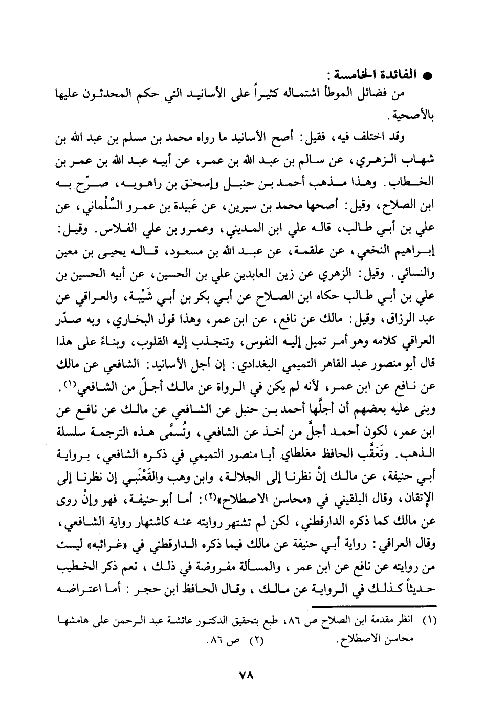 الفائدة الخامسة: من فضائل الموطّأ اشتماله كثيراً على الأسانيد التى حكم المحدثون عليها بالأصحية.