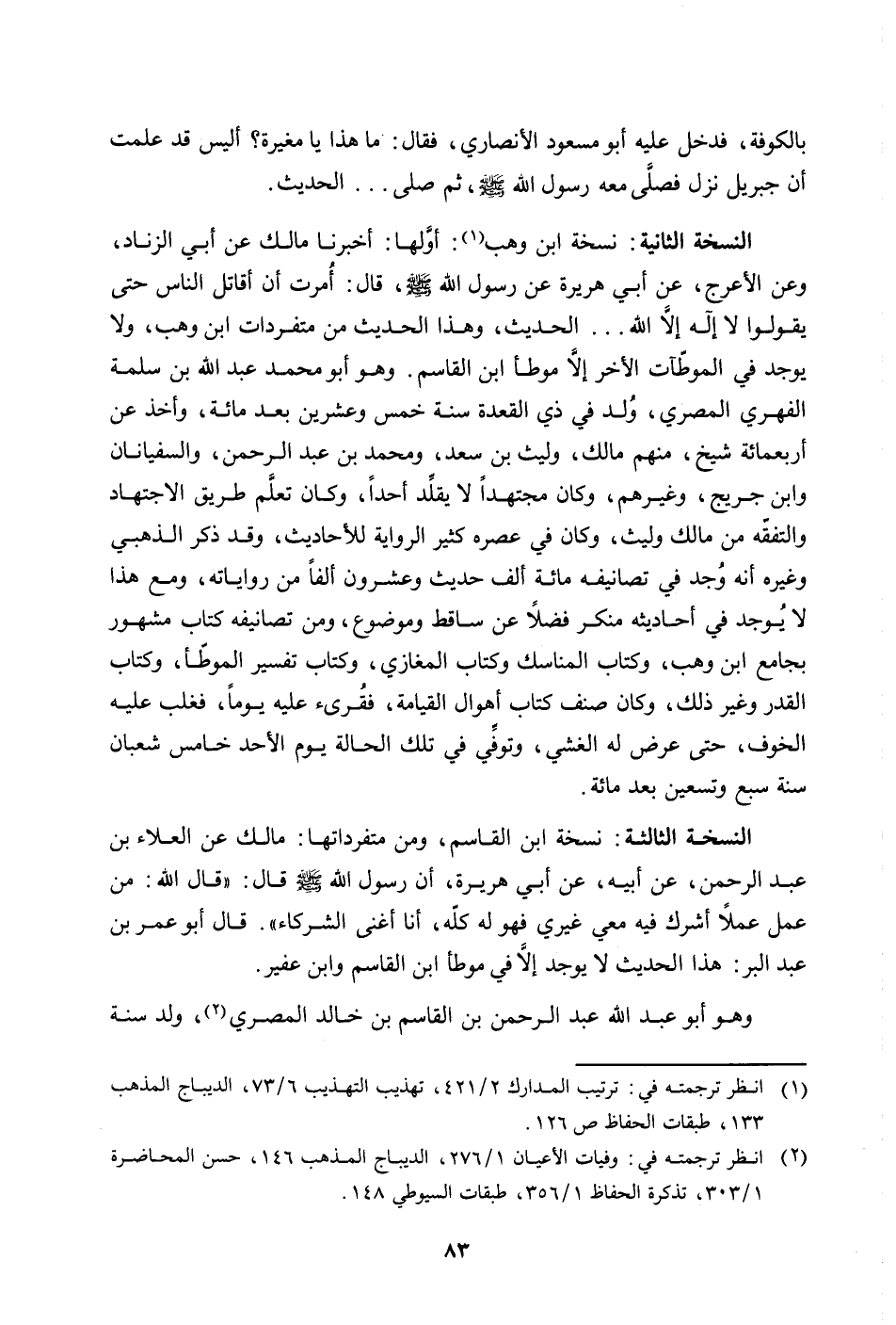 النسخة الثانية: نسخة ابن وهب (أنظر ترجمته في: ترتيب المدارك 2/ 421، تهذيب التهذيب 6/73، الديباج المذهب 133، طبقات الحفاظ ص 126) : أولها: أخبرنا مالك عن أبي الزناد، وعن الأَعْرَجِ، عَنْ أَبِي هُرَيْرَةَ عَنْ رَسُولِ اللَّهِ صلى الله عليه وسلم، قال: أمرت أن أقاتل الناس حتى يقولوا لا إله إلا الله ... الحديث، وهذا الحديث من متفردات ابن وهب، ولا يوجد في الموطآت الأُخر إلاّ موطأ ابن القاسم. وهو أبو محمد عبد الله بن سلمة الفهري المصري، ولد في ذي القعدة سنة خمس وعشرين بعد مائة، وأخذ عن أربع مائة شيخ، منهم مالك، وليث بن سعد، ومحمد بن عبد الرحمن، والسفيانان وابن جريج، وغيرهم، وكان مجتهداً لا يقلد أحداً، وكان تعلم طريق الاجتهاد والتفقه من مالك وليث، وكان في عصره كثير الرواية للحديث، وذكر الذهبي وغيره أنه وجد في تصانيفه مائة ألف حديث وعشرون ألف من رواياته، ومع هذا لا يوجد في أحاديثه منكر فضلاً عن ساقط وموضوع، ومن تصانيفه كتاب مشهور بجامع ابن وهب، وكتاب المناسك وكتاب المغازي، وكتاب تفسير الموطأ، وكتاب القدر وغير ذلك، وكان صنف كتاب أهوال القيامة، فقُرئ عليه يوماً، فغلب عليه الخوف، حتى عرض له الغشي، وتوفي في تلك الحالة يوم خامس شعبان سنة سبع وتسعين بعد مائة.