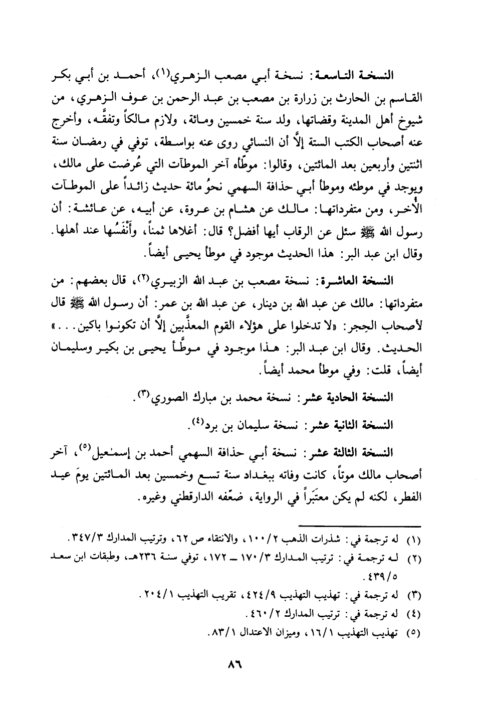 النسخة العاشرة: نسخة مصعب بن عبد الله الزبيري (له ترجمة في: ترتيب المدارك 3/170 - 172، توفي سنة 236 هـ، وطبقات ابن سعد 5/439) ، قال بعضهم من متفرداتها: مالك عن عَبْدُ اللَّهِ بْنُ دِينَارٍ، عَنْ عَبْدِ اللَّهِ بن عمر، أن رسول الله صلى الله عليه وسلم قال لأَصْحَابِ الْحِجْر: "لا تَدْخُلُوا عَلَى هَؤُلاءِ الْقَوْمِ المعذّبين الإ أن تكونوا باكين ... " الحديث، وقال ابن عبد البر: هذا موجود في موطّأ يحيى بن بكير وسليمان أيضاً، قلت: وفي موطّأ محمد أيضاً.