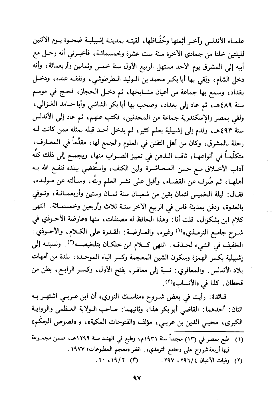 علماء الأندلس وآخر أئِمتها وحُفّاظها، لقيته بمدينة إشبيلية ضحوة يوم الاثنين لليلتين خلتا من جمادى الآخرة سنة ست عشرة وخمسمائة، فأخبرني أنه رحل مع أبيه إلى المشرق يوم الأحد مستهل الربيع الأول سنة خمس وثمانين وأربعمائة، وأنه دخل الشام، ولقي بها أبا بكر محمد بن الوليد الطرطوشي، وتفقه عنده، ودخل بغداد، وسمع بها جماعة من أعيان مشايخها، ثم دخل الحجاز، فحج في موسم سنة 489 هـ، ثم عاد إلى بغداد، وصحب بها أبا بكر الشاشي وأبا حامد الغزالي، ولقي بمصر والإسكندرية جماعة من المحدثين، فكتب عنهم، ثم عاد إلى الأندلس سنة 493 هـ، وقدم إلى إشبيليا بعلم كثير لم يدخل أحد قبله بمثله ممن كانت له رحلة بالمشرق، وكان من أهل التفنن في العلوم والجمع لها، مقدَّماً في المعارف، متكلّماً في أنواعها، ثاقب الذهن في تمييز الصواب منها، ويجمع إلى ذلك كلِّه آداب الأخلاق مع حسن المعاشرة ولين الكنف، واستُقضي ببلده فنفع الله به أهله، ثم صُرف عن القضاء، وأقبل على نشر العلم وبثِّه، وسألته عن مولده، فقال: ليلة الخميس لثمان بقين من شعبان سنة ثمان وستين وأربعمائة، وتوفي بالعدوة، ودفن بمدينة فاس في الربيع الآخر سنة ثلاث وأربعين وخمسمائة. انتهى كلام ابن بشكوال، قلت أنا: وهذا الحافظ له مصنفات، منها "عارضة الأحوذي في شرح جامع الترمذي" (طبع بمصر في (13) مجلداً سنة 1931 م؛ وطبع في الهند سنة 1299 هـ، ضمن مجموعة فيها أربعة شروح على جامع "الترمذي". انظر"معجم المطبوعات" (1977) وغيره، والعارضة: القدرة على الكلام، والأحوذي: الخفيف في الشيء لحذقه. انتهى كلام ابن خلكان بتلخيصه (وفيات الأعيان 4/296، 297) . ونسبته إلى إشبيلية بكسر الهمزة وسكون الشين المعجمة وكسر الباء الموحدة، بلدة من أمهات بلاد الأندلس. والمعافري: نسبة إلى معافر، بفتح الأول، وكسر الرابع، بطن من قحطان. كذا في "الأنساب". (2/19، 20) .
