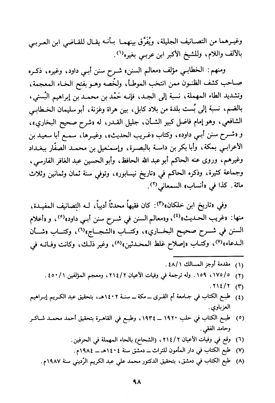 وفي "تاريخ ابن خلكان" (2/214) : كان فقيهاً محدثاً أديباً، له التصانيف المفيدة، منها: "غريب الحديث" (طبع الكتاب في جامعة أم القرى - مكة - سنة 1402 هـ، بتحقيق عبد الكريم إبراهيم العزباوي) ، و"معالم السنن في شرح سنن أبي داود" (طبع الكتاب في حلب 1920 - 1934، وطبع في القاهرة بتحقيق أحمد محمد شاكر وحامد الفقي) ، و"أعلام السنن في شرح صحيح البخاري"، وكتاب "الشجاج" (وقع في وفيات الأعيان 2/214، (الشحاح) بالحاء المهملة في الحرفين) ، وكتاب "شأن الدعاء" (طبع الكتاب في دار المأمون للتراث دمشق سنة 1404 هـ 1984 م) ، وكتاب"إصلاح غلط المحدثين" (طبع الكتاب في دمشق، بتحقيق الدكتور محمد علي عبد الكريم الرّديني سنة 1987 م) ، وغير ذلك، وكانت وفاته في
