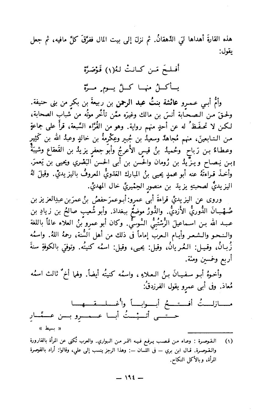 عمرو بن الحاف بنت قضاعة. وخندفُ جِذم رسول الله صلى الله عليه وسلم. وهم أشراف مضر. وحديث إلياس وبنيه وامرأته مشهور في كتب التَّواريخ. ذكر ابنُ إسحاق أن مدركة وطابخة كانا في إبلٍ لهما يرعيانها، فاقتنصا صيداً، فقعدا عليه يطبخانه. وعدت عاديةٌ على إبلهما. فقال عامر، وهو مدركةُ، لعمرو، وهو طابخةُ: أتدرك الإبل أم تطبخُ هذا الصَّيد؟ فلحق عامرٌ بالإبل، فجاء بها. فلما راحا على أبيهما، وحدَّثاهُ قال لعامر: أنت مُدركة، وقال لعمرو: وأنت طابخةُ. والخبزُ عند أهل العلم بالنَّسب في هذه القصة أطولُ من هذا، وأحسن سياقةً. واتى به ابن إسحاق مُختصراً. قال ابن إسحاق ومصعب الزُّبيريُّ: خُزاعةُ في مضر، وهم من ولد قمعة بن الياس بن مضر. وقال ابنُ إسحاق: خزاعة هو كعب بن عمرو بن لُحي بن قَمعةَ بن خندف. وقد ذكر أن ولد الياس بن مضر ينتسبون إلى أمِّهم خندف. ورُوي عن أبي حَصينٍ الوادعيِّ عن أبي صالح، عن أبي هريرة أن النبي صلى الله عليه وسلم قال: عَمرو بن لُحَيِّ بن قَمعةَ بن خِندفَ هو أبو خُزاعةَ. هذا قولُ نُسَّاب مضر وخُزاعةُ تأبى هذا، وتقول: نحن بنو عمرو بن ربيعة بن حارثة بن عمرو بن عامر بن حارثة بن امرىء القيس بن ثعلبة بن مازن بن الأزد بن الغوث، وخندفُ أمُّنا. ذكر هذا أبو عبيدة معمر بن المثنى وابن الكلبي. فعلى قول ابن إسحاق ومُصعب: خزاعة مُضريَّةٌ في عدنان، وعلى قول أبي عبيدة وابن الكلبيِّ: خزاعةُ قحطانيَّة في اليمن. وإنما سُميت خُزاعة، لأنهم تخزَّعوا من ولدِ عمرو بن عامرٍ، أي فارقوهم حين أقبلُوا من اليمن، يريدون الشام. فنزلوا بمرِّ الظَّهران بجنبات الحَرم، ووَلوُا حجابةَ البيت دَهراً.