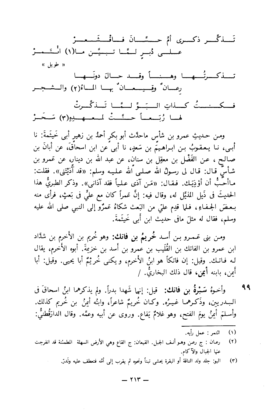 .... وسماكُ بن خرشة النصاريُّ، وليس بأبي دجانة، على عمر في وفود أهل الكوفة بالأحماس، فانتسبوا له سِماك وسماك وسماكٌ. فقال: بارك الله فيكم، اللهم اسمُك بهم الإسلام وأيدِّ بهم ومنهم وابصة بن معبد بن عبيد الأسديُّ، ويكنى أبا شدَّاد، ويقال: أبا فِرصافة. سكن الكوفة ثم تحوَّل إلى الرقة، ومات بها. له صُحبة ورواية، روى عن النبيِّ صلى الله عليه وسلم أنه أمَرَ رجلاً يصلي خلف الصفِّ وحده أن يُعيد الصلاة.