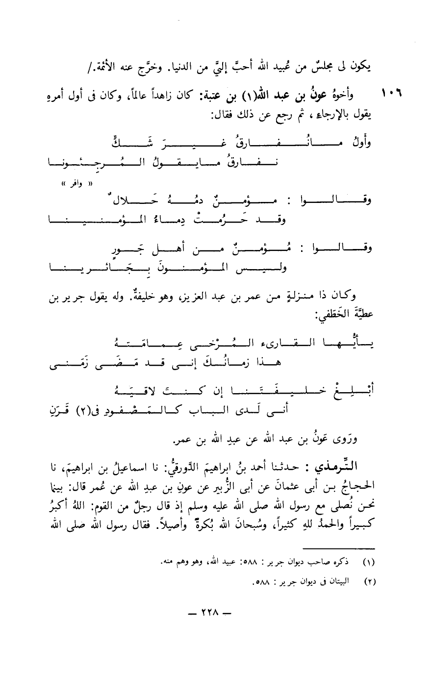 ومِن هُذيل أبو خِراش الشاعر: واسمُه خُويلدُ بنُ مُرَّةَ القِرْديُّ. وقِرْدٌ اسمُه عُميرُ بنُ مُعاويةَ بن تميم بن سعد بن هُذيل. مات في زمن عمر بن الخطاب من نَهشِ حية. وله في ذلك خبرٌ عجيبٌ يأتي بعدُ. وكان ممَّن يَعدو على قدميه فيسبق الخيلَ. وكان في الجاهلية من فُتاك العرب، ثم أسلمَ فحسنَ إسلامُه. وهو القائلُ في الجاهلية في عَدْوِهِ: