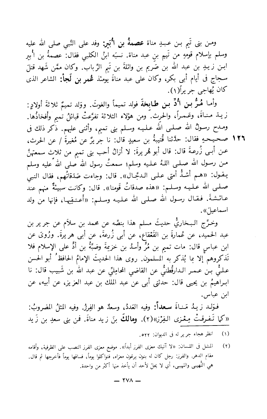 ومنهم عِكراشُ بن ذُؤيبٍ: قَدِم على رسول الله صلى الله عليه وسلم بصدقات قومه بني مُرَّة. فقال له: " مَن أنت؟ ". قال: أنا عِكراشُ بن ذؤيب. فقال له: ارفع في النَّسب. فقال ابن حُرْقوص بن جَعدة بن عمرو بن النزّال بن مرَّة بن عُبيد. وهذه صدقاتُ بني مُرَّة بن عُبيد. قال فأمر بها رسول الله صلى الله عليه وسلم، فوُسمتْ بِمِيسَم الصدق، وضُمَّتْ إلى إبل الصدقة.