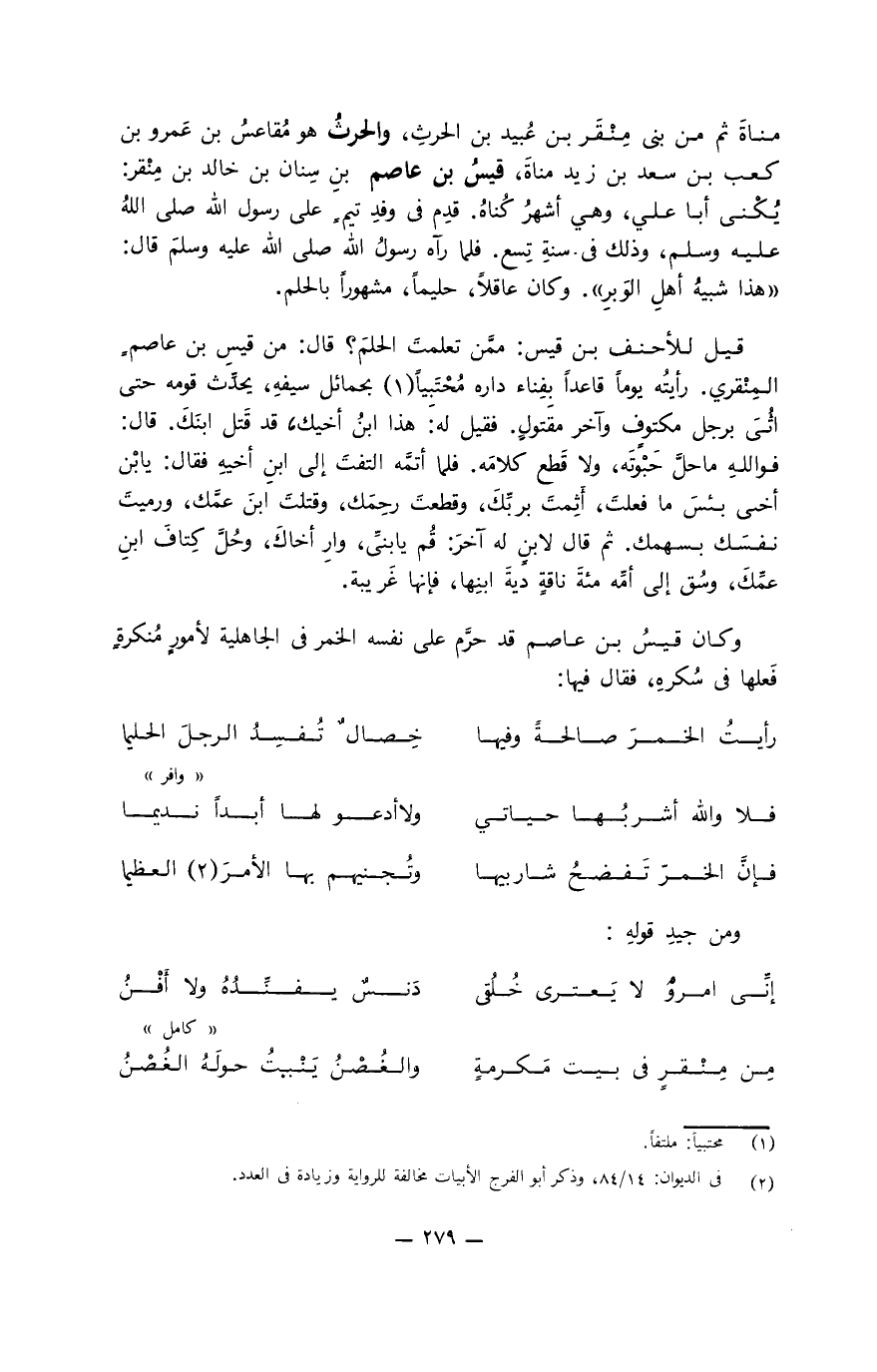 قال ابو اليقظان: أمُّ عمرو بن الأهتم بنت فَدَكِّي بن أعبُدَ. ويكنى عمرو بن الأهتم أبا ربْعي. قدم على النبيِّ صلى الله عليه وسلم وافدا في وجوه قومه من بني تميم فأسلم، وذلك في سنة تسع من الهجرة. وكان فيمن قَدِمَ معه الزِّبرِقانُ بن بدر وقيس بن عاصم. ففخر الزِّبرِقان، فقال: يا رسول الله، أنا سيد تميم والمطاع فيهم، والمُجاب منهم، آخذ لهم بحقوقهم، وأمنعهم من الظلم، وهذا يعلم ذلك. يعني عمرو بن الأهتم. فقال عمرو: إنه لشديد العارضة، مانع لجانبه، مطاع في أدْنَيْهِ. فقال الزبرقان: والله لقد كذب يا رسول الله، وما منعه من أن يتكلم إلا الحسد. فقال عمرو: أنا أحسدك!، فوالله إنه للئيم الخال، حديث المال، أحمق الوالد، مُبَّغَضٌ في العشيرة. والله ما كذبت في الأولى، ولقد صدقت في الثانية. فقال النبي صلى الله عليه وسلم: " إنَّ من البيان لسحراً ". وكان خطيبا جميلا يدعى " المُكحَّلَ " لجماله، بليغا، شاعرا، محسنا. يقال: إن شعره كان حُللاً مُنشَّرة، وكان شريفا في قومه. وهو القائل لقيس بن عاصم حين أزرى به عند النبي صلى الله عليه وسلم، وقال: إنه غلام حدث خلَّفناهُ في ركابنا. والخبر مشهور.