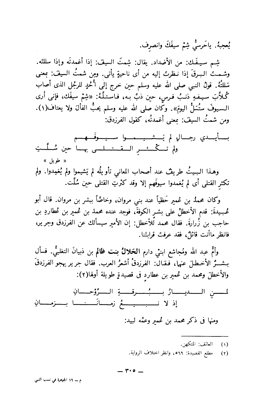 الأكرمين. قال: فأنت إذا من زيد مناة؟ قلت: أجل. قال: فمن الجدود أم من البحور أم من الثِّماد؟ فعلمت أن الجدود مالك وأن البحور سعد، وأن الثماد بنو القيس بن زيد بن مناة. قلت: من الجدود. قال: فإنت إذا من بني مالك؟ قلت: أجل. قال: أفمن الذرى أم من الأرداف؟ فعلمت أن الذرى حنظلة، وأن الأرداف ربيعة ومعاوية، وهما الكُردوسانِ قلت: من الذرى. قال: فأنت إذا من بني حنظلة. قلت: أجل. قال: أفمن البدور أم من الفرسان أم من الجارثيم؟ فعلمت أن البدور مالك، وأن الفرسان يربوع، وأن الجارثيم البراجم. قلت: من البدور. قال: فأنت إذا من بني مالك بن حنظلة. قلت: أجل. قال: أفمن الأرنبة أم من القف؟ فعلمت أن الأرنبة دارم، وأن اللحيين طهية والعدوية، وأن القفا ربيعة بن حنظلة. قلت: من الأرنبة. قال: فأنت إذا من دارم؟ قلت: أجل. قال: أمن اللباب أم من الهضاب، أم من الشهاب؟ فعلمت أن اللباب عبد الله، وأن الهضاب مجاشع، وأن الشهاب نهشل. قلت: من اللباب. قال: فأنت إذا من بني عبد الله؟ قلت: أجل. قال: أفمن البيت أم من الزوافر؟ فعلمت أن البيت بنو زرارة، وأن الزوافر الأحلاف. قلت: من البيت. قال: فأنت إذا من بني زرارة؟ قلت: أجل. قال: فإن زرارة ولد عشرة: حاجيا، ولقيطا، وعلقمة، ومعبدا، وخزيمة، ولبيدا، وأبا الحرث، وعمرا، وعبد مناة، ومالكا. فمن أيهم أنت؟ قلت من بني علقمة. قال: فإن علقمة ولد شيبان، لم يلد غيره. فتزوج شيبان ثلاث نسوة مهدد بنت حُمران بن بشر بن عمرو بن مرثدٍ، فولدت له يزيد. وتزوج عكرشة بنت حاجب بن زرارة بن عُدس، فولدت له المأمور، وتزوج عمرَة بنت بِشْر بن عمرو بن عُدْس، فولدت له المُقعد، فلأيهن أنت؟ قلت: لمهدد. قال: يابن أخي، ما افترقت فرقتان بعد مدركة إلا كنت في أفضلهما حتى زاحمك أخواك، فإنهما أن تلدنى أمهما أحب إلي من أن تلدني أُمك. يابن أخي أتُراني عرفتك؟ قلت: إي وأبيك، أيُّ معرفة؟! ومن بني مجاشع بن دارم صعصعة بن ناجية بن عقال بن محمد بن سفيان