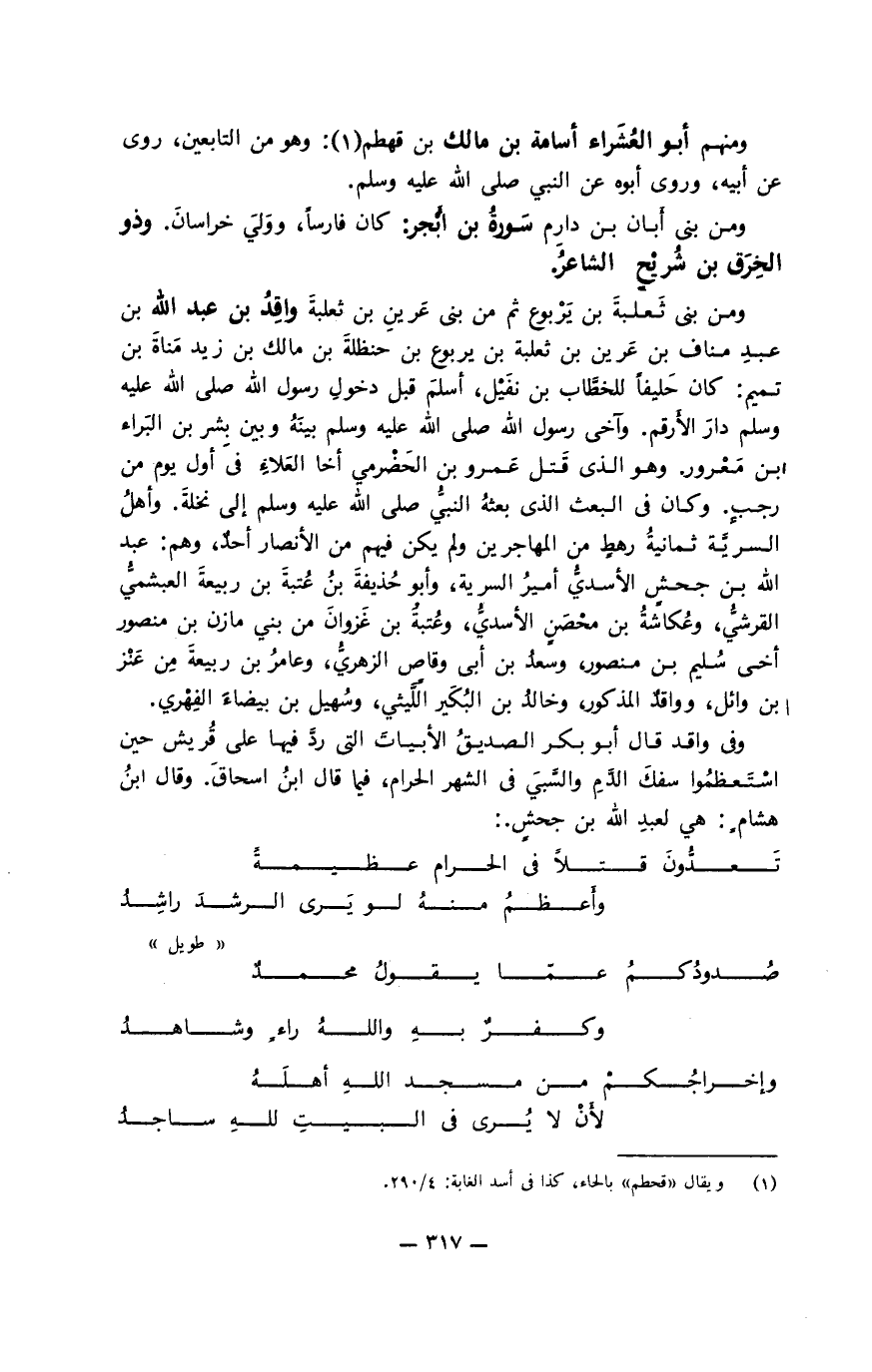 ومن بني حزام بن عمرو بن حبشية بن سلول بن كعب سليمان بن صرد ابن الجون بن أبي الجون بن منقذ بن ربيعة بن أصرم، يكنى أبا مطرِّف. كان خيِّرا فاضلا، له دين وعبادة. كان اسمه في الجاهلية يسارا، فسمَّاه رسول الله صلى الله عليه وسلم، حين أسلم، سليمان. سكن الكوفة وابتنى بها دارا في خزاعة، وكان نزوله بها في أول ما نزلها المسلمون. وكانت له سن عالية وشرف في قومه وشهد مع عليّ صفين. وكان فيمن كتب إلى الحسين بن علي عليهما السلام، يسأله القدوم إلى الكوفة. فلما قدمها ترك القتال معه، فلما قتل الحسين ندم هو والمسيَّب بن الفزاريُّ وجميع من حوله، إذ لم يقاتلوا معه. ثم قالوا: مالنا توبة ممَّا فعلنا إلا أن نقتل أنفسنا في الطلب بدمه. فخرجوا، فعسكروا بالنخيلة، وذلك في مستهلِّ ربيع الآخر سنة خمس وستين، وولَّوا أمرهم سليمان