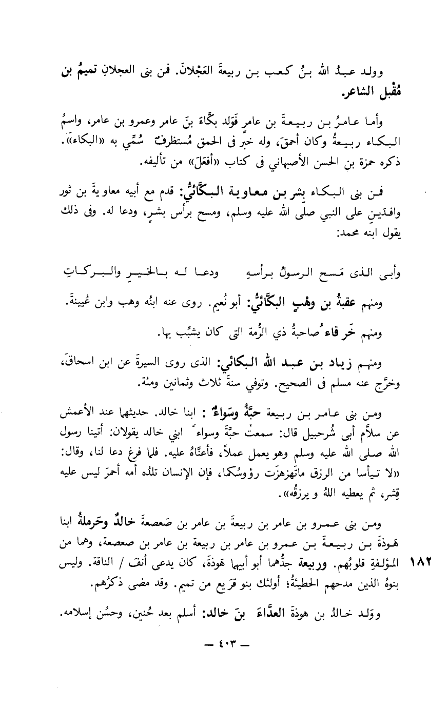 ومن بني عروة بن مسعود أبو مليح وعاصم.... وأما عاصمُ بن عُروة فولد يعقوب، وهو من التابعين. روى عن عبد الله بن عمرو بن العاصي حديث " يخرج الدجَّال في أمتي فيمكث أربعين ". وهو حديث طويل خرَّجه مسلم. وكان لعروة أخ شقيق اسمه الأسودُ بن مسعود: مات مشركا. وابنه قاربُ بن الأسود: هو الذي سأل رسول الله صلى الله عليه وسلم أن يقضي دين أبيه الأسود من مال الطاغية. فقال له عليه السلام: " إن الأسود مات مشركا ". فقال قارب: لكن تصل مسلما ذا قرابة يعني نفسه إنما الدَّين عليَّ، وأنا الذي أطلب به. فأمر رسول الله صلى الله عليه وسلم أبا سفيان فقضى دين الأسود من مال الطاغية.