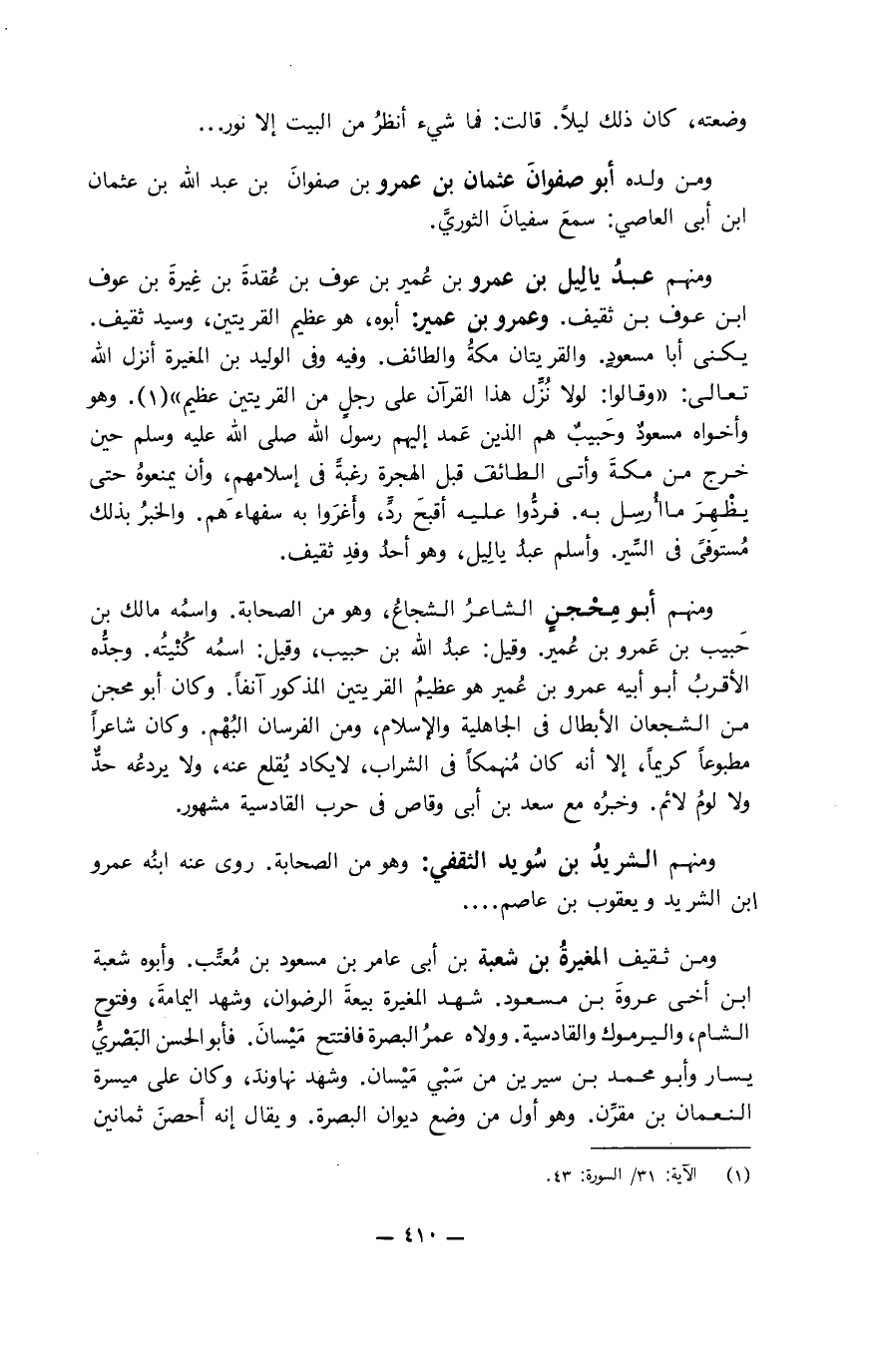 ومن ثقيف الأخنس بن شريف بن عمرو بن وهب حليف بني زهرة. وكان شريفاً فيهم، مطاعاً فيما يقول. وهو ردَّ بني زهرة عن حضور بدرٍ، فلم يشهد زهريٌّ مع المشركين وقعة بدر. وكان يصيب من رسول الله صلى الله عليه وسلم، ويرد عليه بمكة. وفيه أنزل الله تعالى:) ولاتُطعْ كلَّ حلاَّف مَهين، همَّازٍ مشَّاءٍ بنميمٍ، منَّاعٍ للخير، مُعتدٍ أثيم، عُتُلٍّ بعد ذلك زَنيمٍ (. ولم يقل) زنيمٍ (لعيب في نسبه؛ إن الله تعالى لا يعيب أحداً بنسب، ولكن حقَّق الله تعالى بذلك نعْتَه ليُعرف. والزنيم: الدخيل في القوم، وليس منهم. قال الخطيم التميميُّ في الجاهلية: