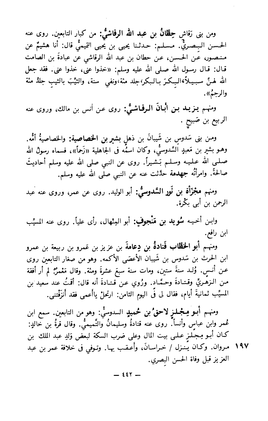 ومن موالي بني شيبانَ أبو عبد محمد بن الحسن: صاحبُ أبي حنيفةَ. حضر مجلسَه سنتين، ثم تفقَّه على ابنه. وصنف الكتب الكثيرة، ونشر علم أبي حنيفةَ.